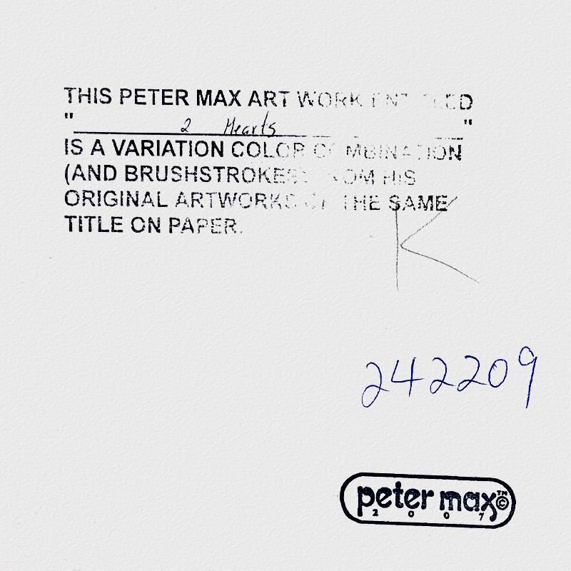 "2 Hearts" is a hand signed one-of-a-kind acrylic mixed media on paper by Peter Max. The piece comes custom framed with a backside cutout to display Peter Max Studio registration number 242209 certifying authenticity. Measures approximately 26" x 30" (frame), 13" x 17" (image). This item requires special handling and may have a longer than usual turnaround.