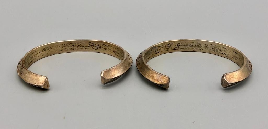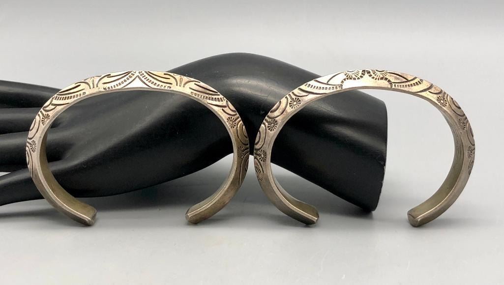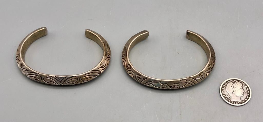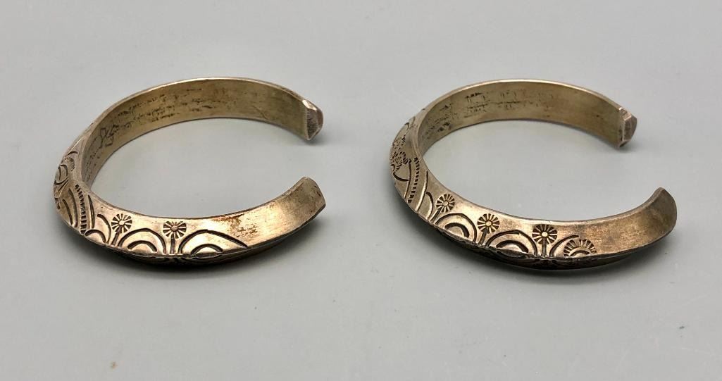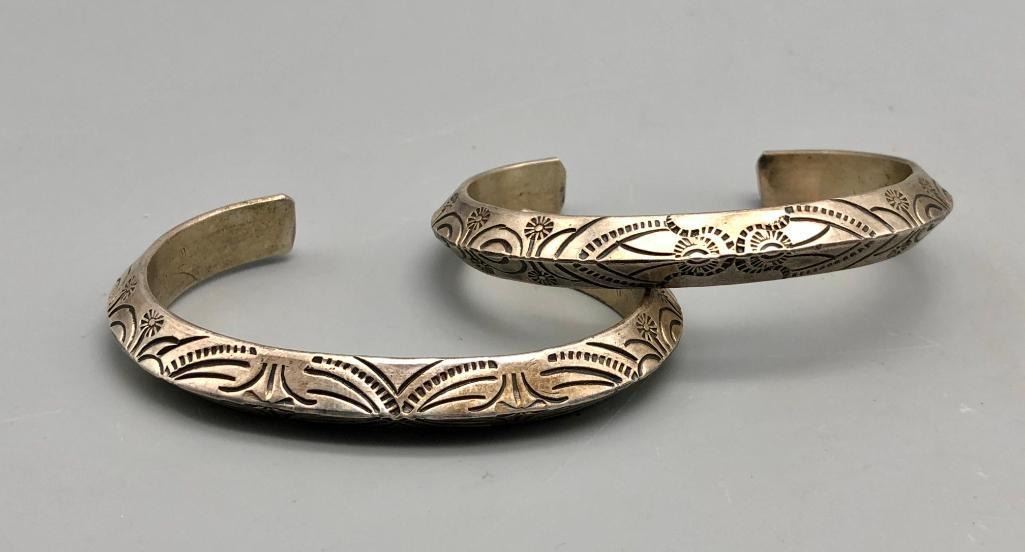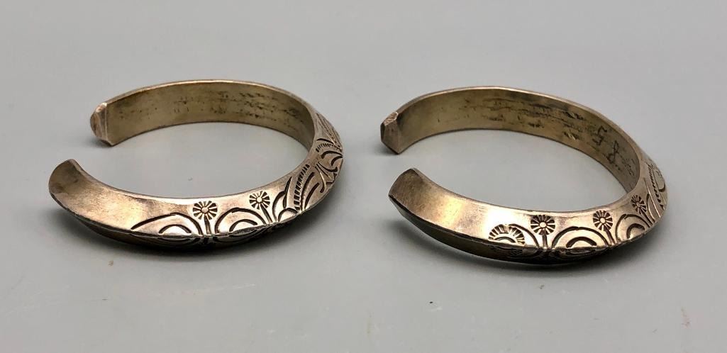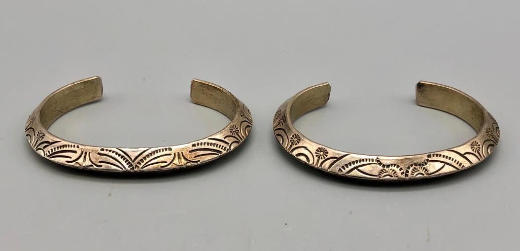 Up for consideration are two heavy duty silver bracelets. Both of these beautiful bracelets have similar hand stamped designs, styled on a hand forged triangular style band. These are nice heavy duty bracelets and are top quality. They are sterling silver and perfect for stacking. MAKER: Unmarked. APPROX AGE: Circa 1960s-1970s. SIZE: Both inside circumference measures 5-3/4 inches long. Opening is an additional 1-1/4 inch opening, fitting a 7 inch wrist. Widths are 3/8 inches. Weighs 109.8 grams. CONDITION: Good for their age, normal wear expected. Please look closely at the pictures as they are an important part of our description and are hereby incorporated into the description, specifically with regards to condition. SHIPPING: There will be a $5 handling / packaging fee for shipping this lot. The actual cost of postage will be added on top of that. BUY IT NOW: If you would like to buy this item now, without waiting for the auction day to bid on it, we do offer this option (which is available up to 48 hours before the actual auction starts). The “Buy it Now†price is the high estimate of this lot (plus applicable fees and the Buyer's premium is discounted to 10% when using the Buy it Now option). If you would like to exercise this option, you must contact us by email (or phone as long as you talk to someone live). Reference this lot number and your intention to "Buy it Now."