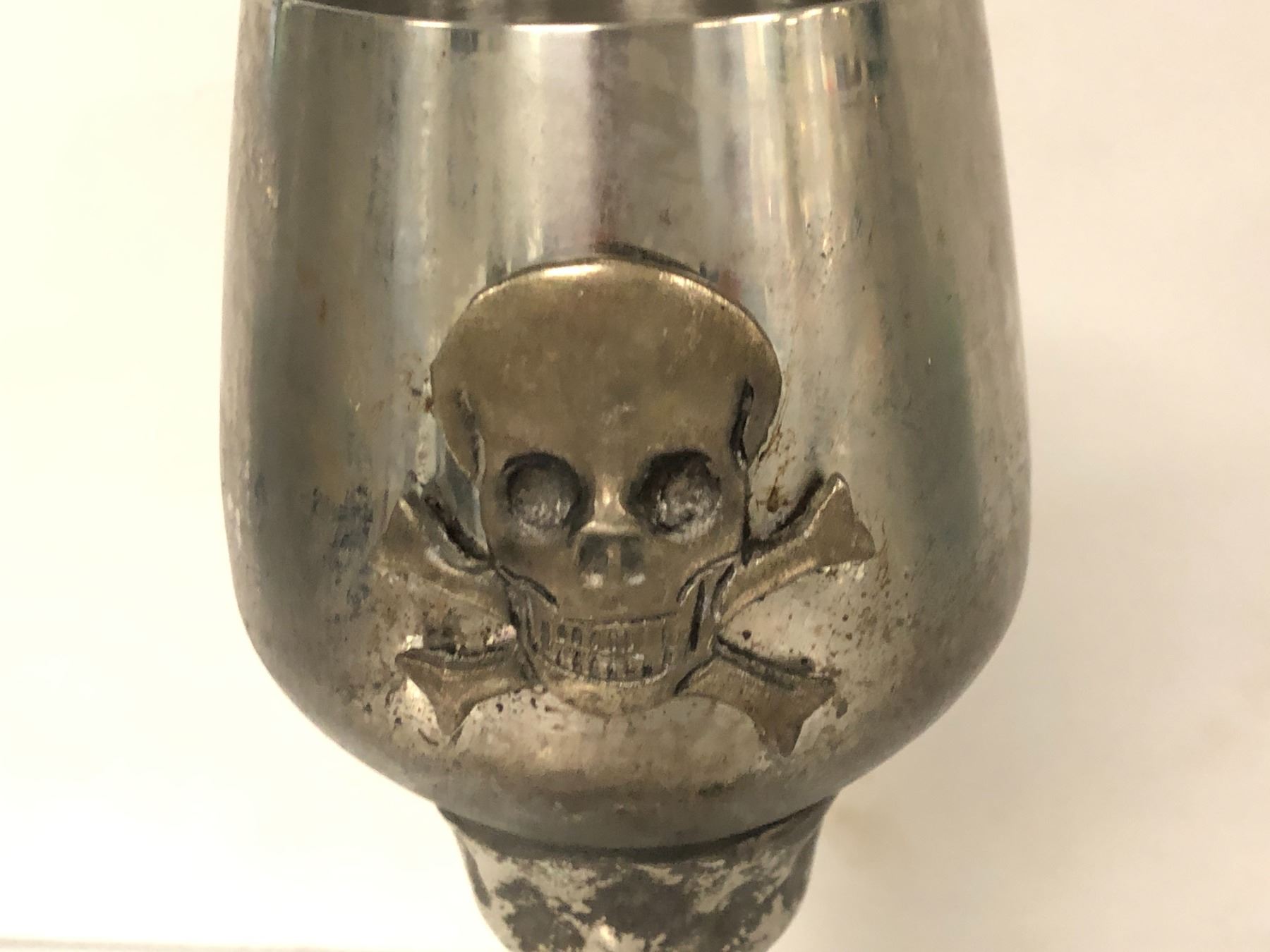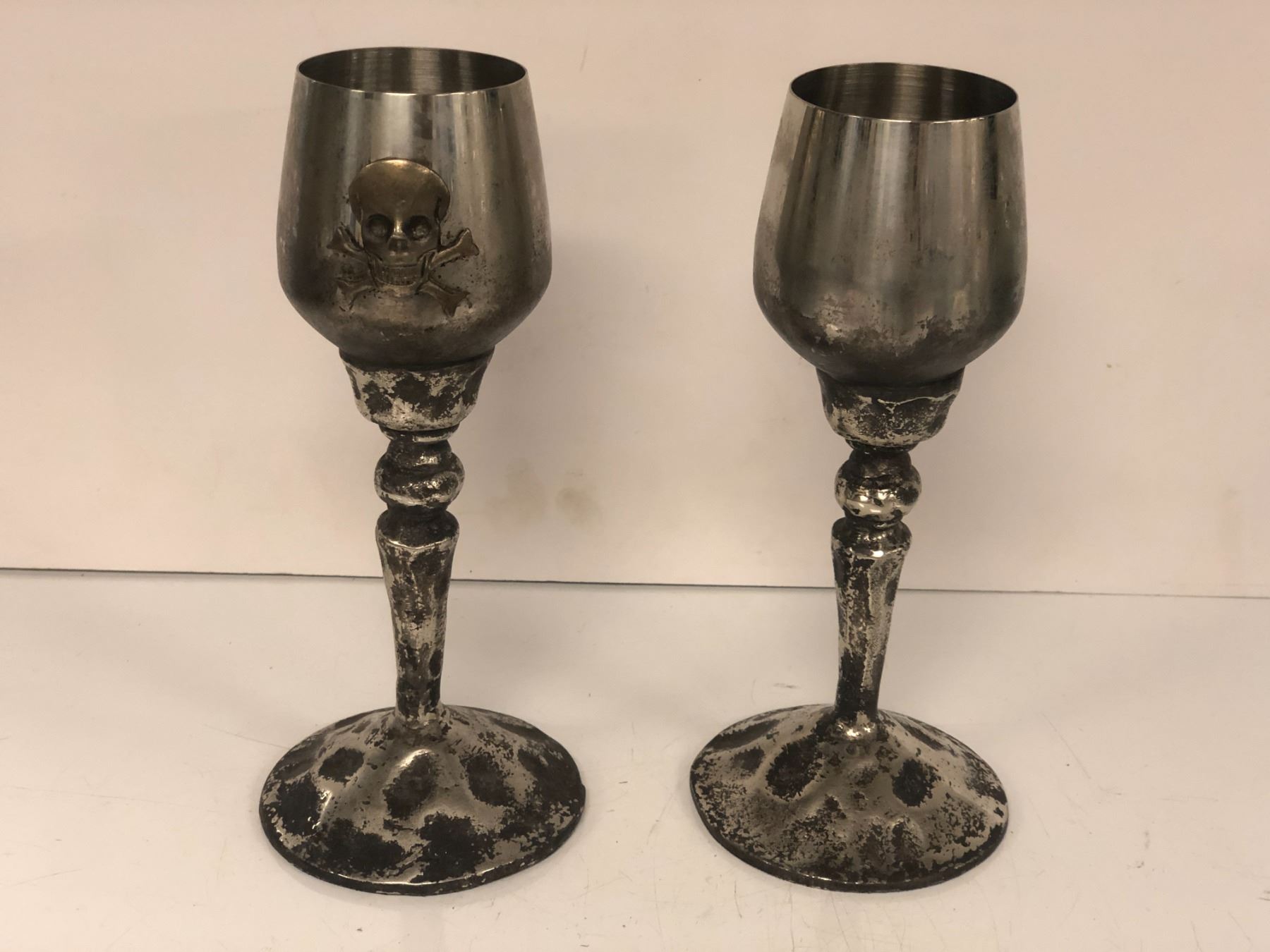 2 "Hero" (Boy) metal chalices - 1 w/ skull & cross bones motif - ep. 106 sc 18,24 (From the superhero show)