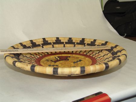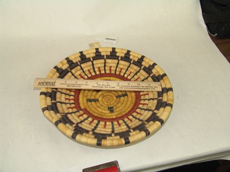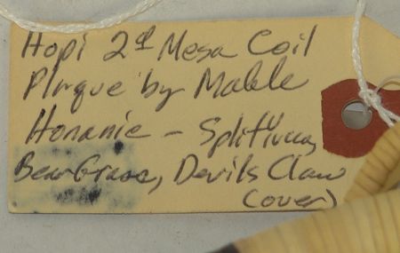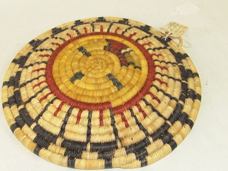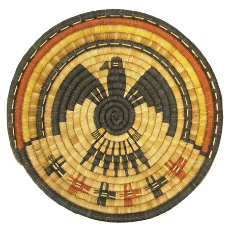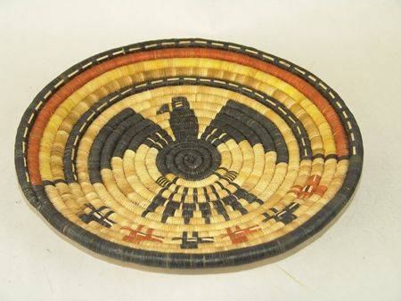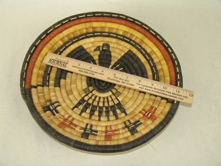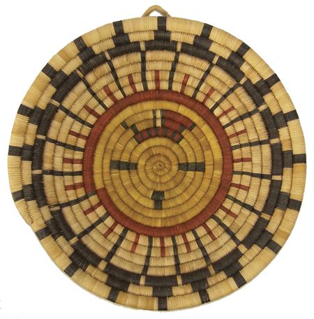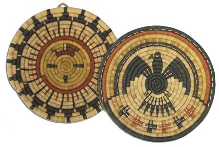 Ca. 1960-1970s, Pair of beautiful coiled weave polychrome plaques; one with a sunface (by Honanie), the other an eagle with animal heads across the bottom. Both in very good condition. Both 12-1/2"