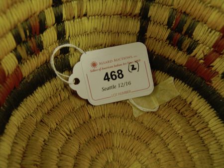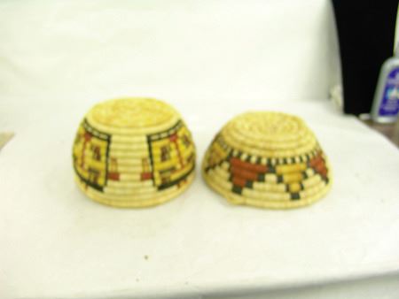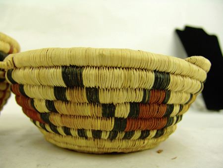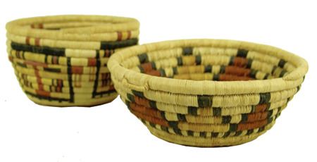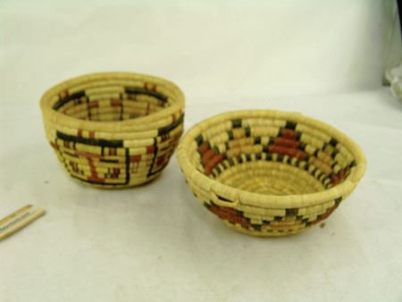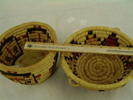 Mid 1900s, Two great examples of 2nd Mesa coiled basketry including a bowl with kachina head figures and a shallower bowl with geometrics. Both in very good condition. Taller 4-1/2" x 7-1/2"