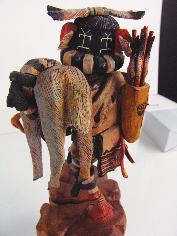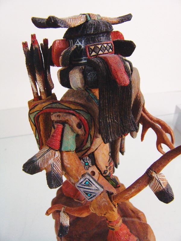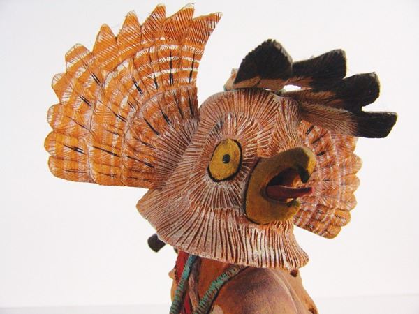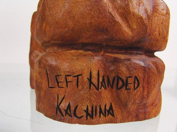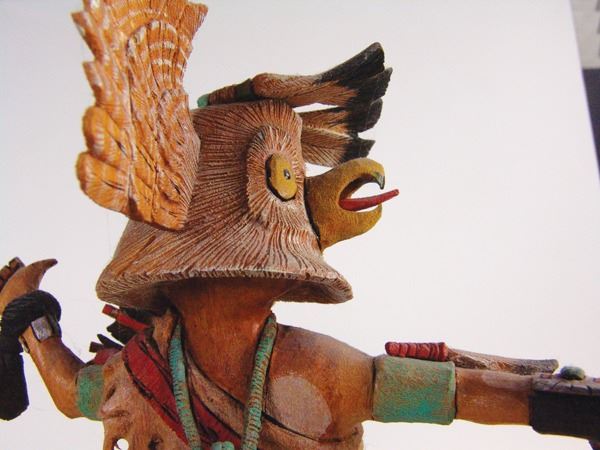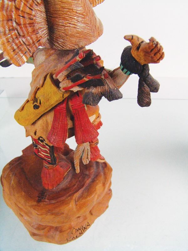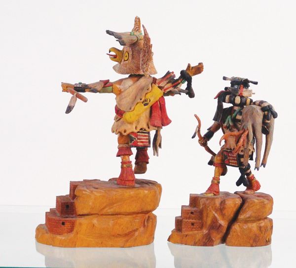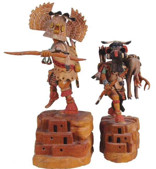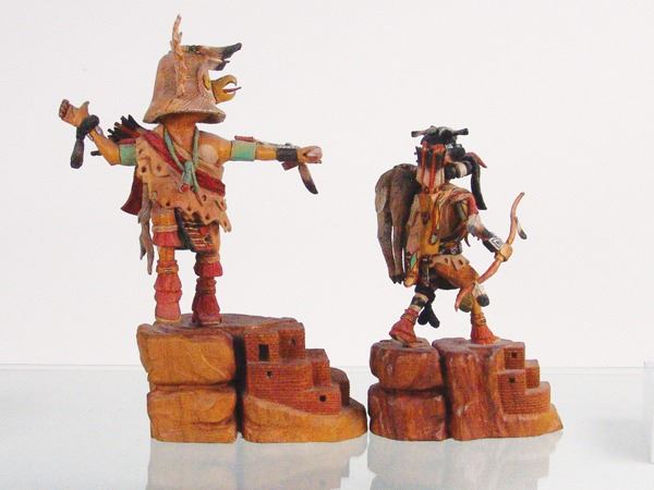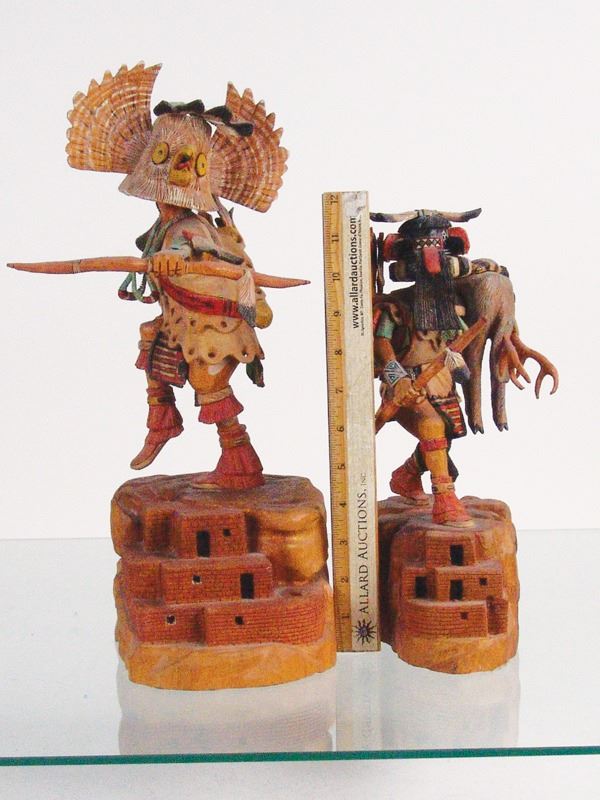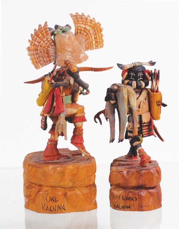 Pair of fantastic, hand carved and painted, cottonwood root dolls done with exacting detail, an owl dancer with bow, and a rare left handed kachina shown carrying his pray on his shoulders. Very good condition, minorLate 1900s12", 16"