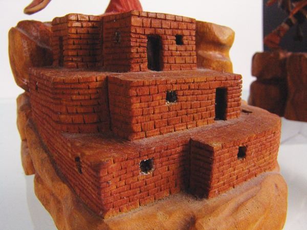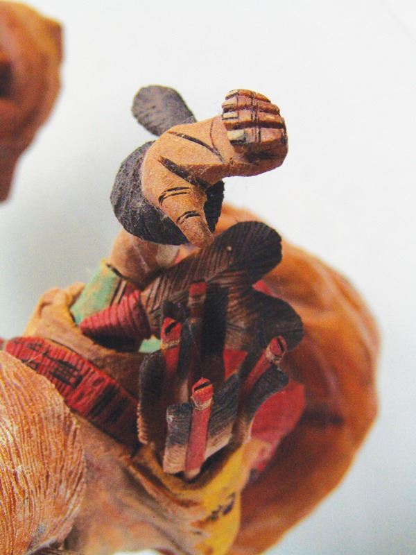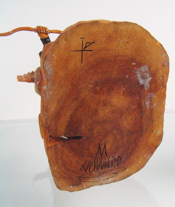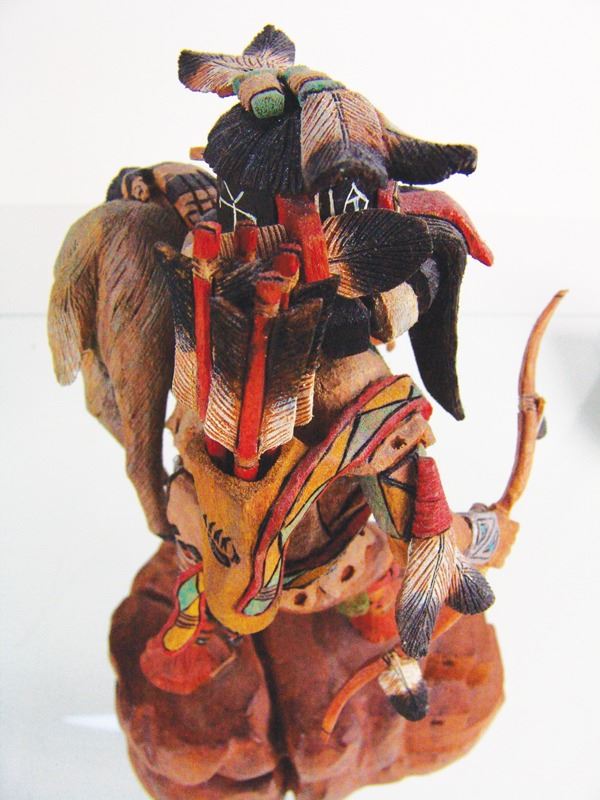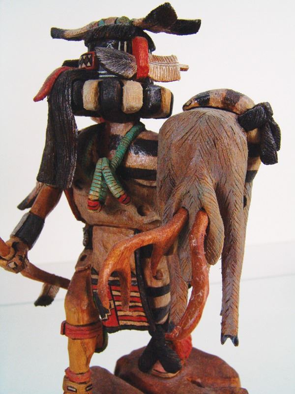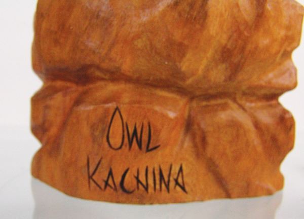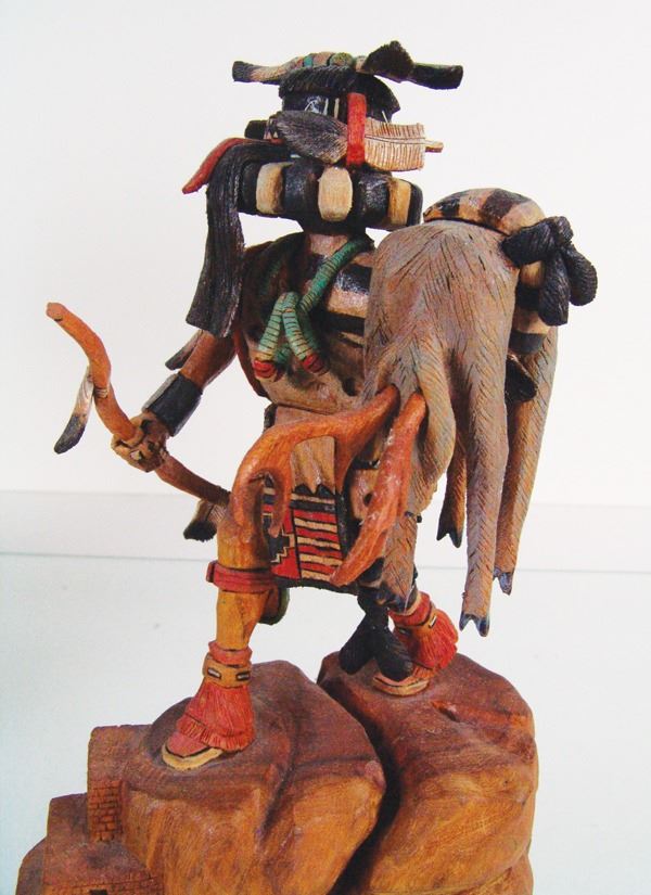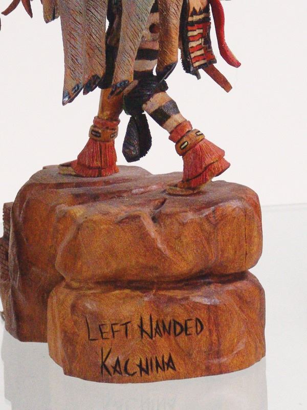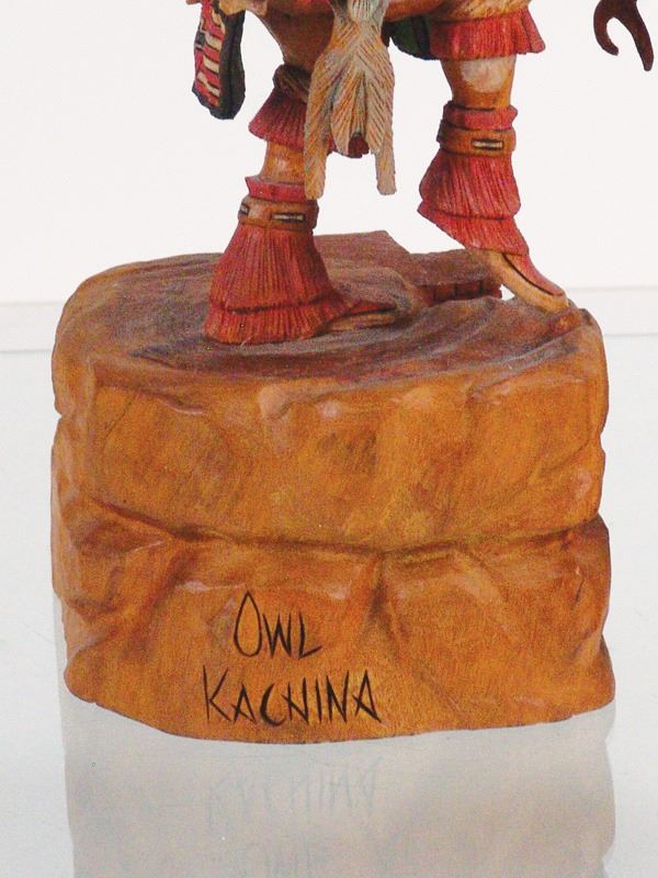 Pair of fantastic, hand carved and painted, cottonwood root dolls done with exacting detail, an owl dancer with bow, and a rare left handed kachina shown carrying his pray on his shoulders. Very good condition, minorLate 1900s12", 16"