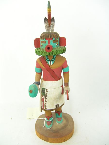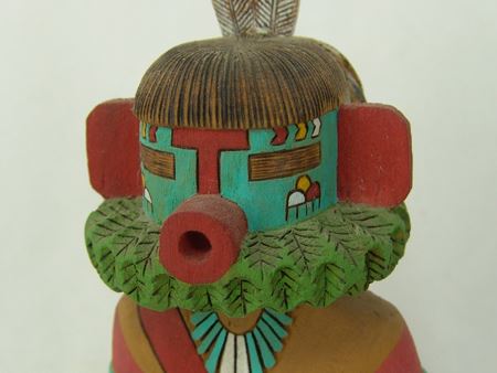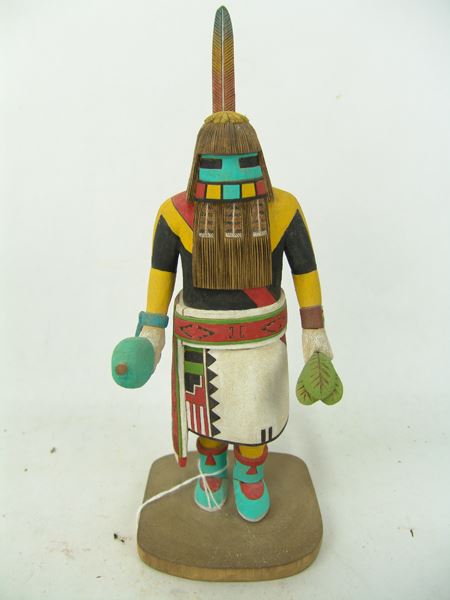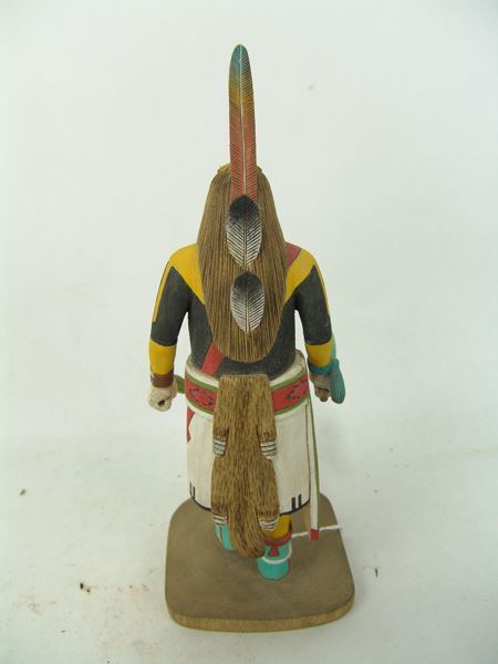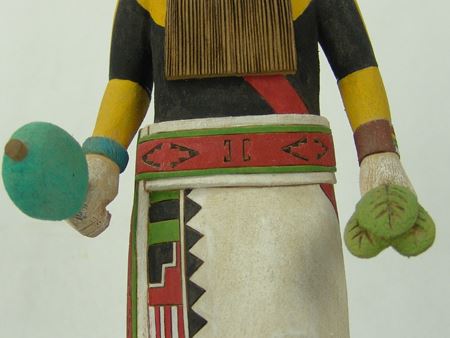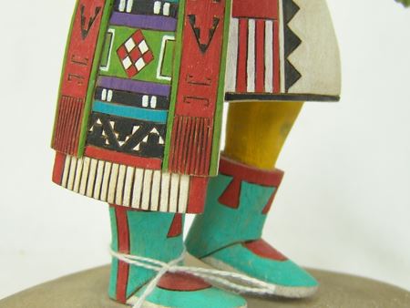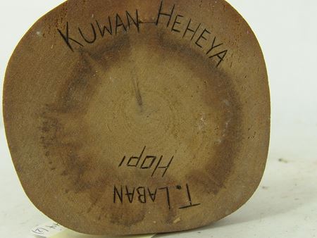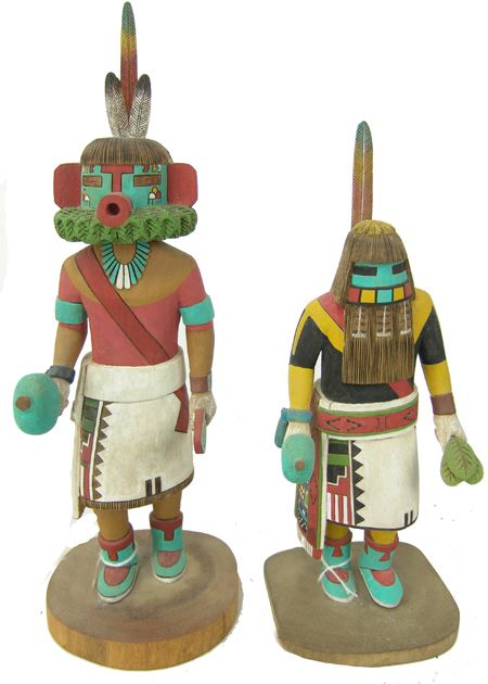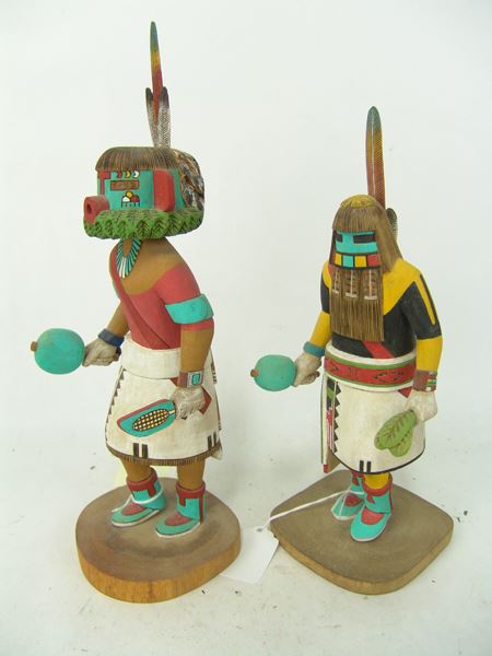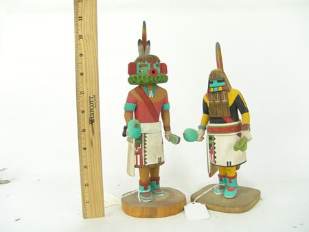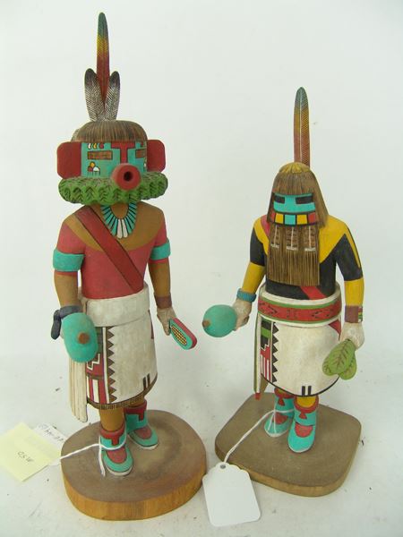Late 1900s, Pair of hand carved and painted cottonwood root dolls, the shorter a "longhair" with yellow beard, the other a "Kuwanheheya." Both in very good condition, minor repairs. Tallest 11"
