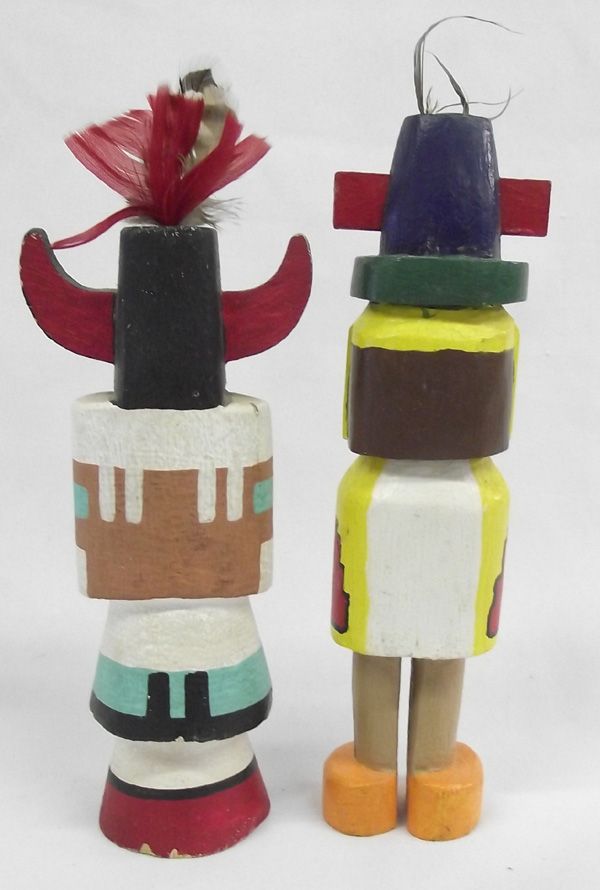 2 Hopi Kachinas. One kachina is called, ''The Whipper'' and is signed Scott Beber. It has black horns and feathers on the top of its head. It measures 8''H x 2''W. The other figure is brightly painted and is not signed.
