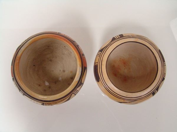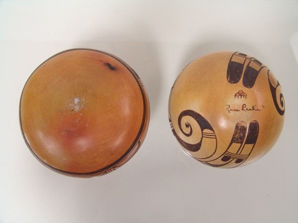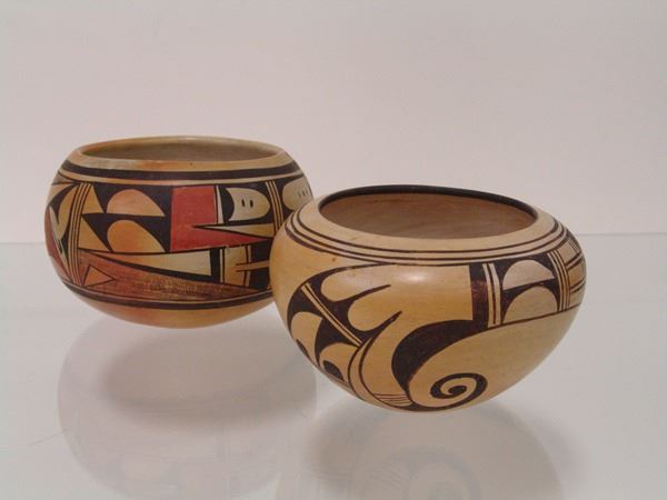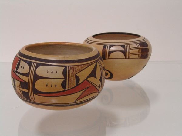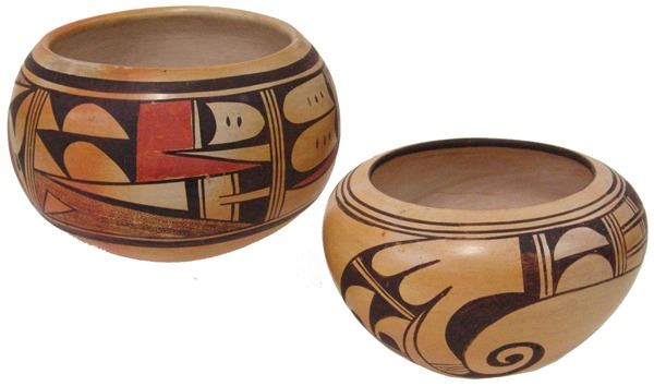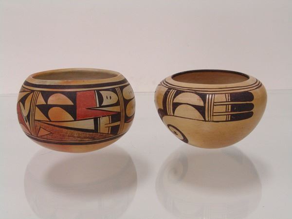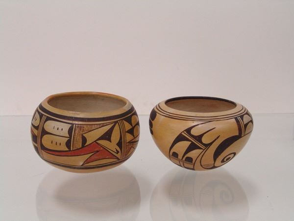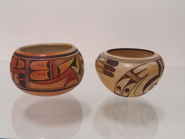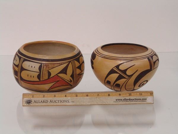 Early /Mid 1900s Largest 5" x 7" Includes a small two-tone bowl by Rena Leslie, plus a larger polychrome (unsigned) both with Avian inspired motifs. Good condition, the larger with minor rim damage