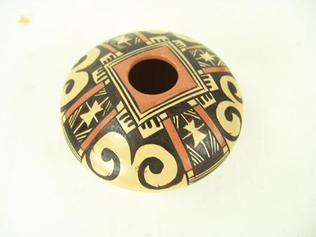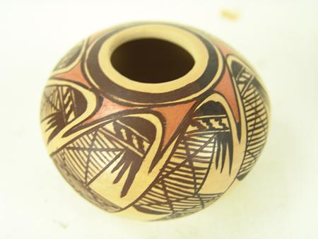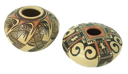 Circa Late 1900s, Pair of fine small seed jars with traditional Hopi polychrome motifs. Both in very good condition and signed. 2-1/2" x 3-1/2" largest