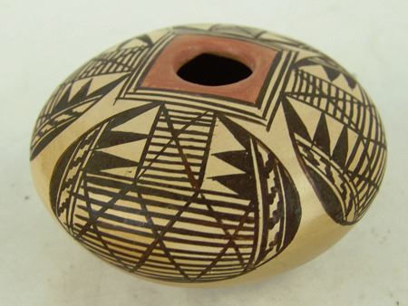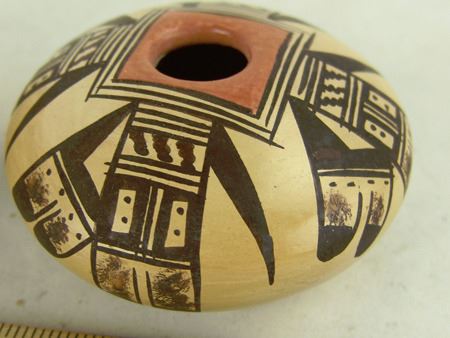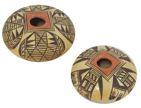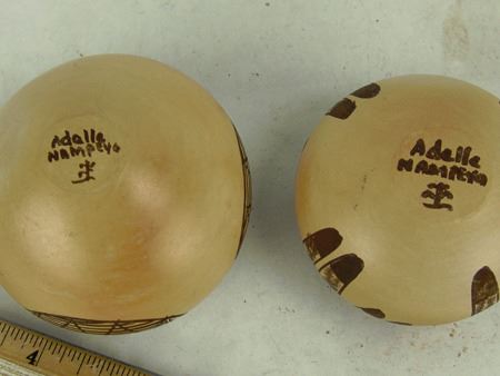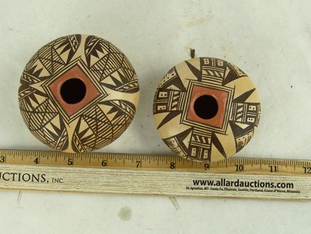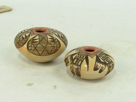 Late 1900s, Pair of similar small polychrome seed jars with Nampeyo-style designs. Both very good condition. 1-1/2" x 3" & 2" x 3-1/4"