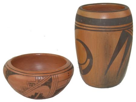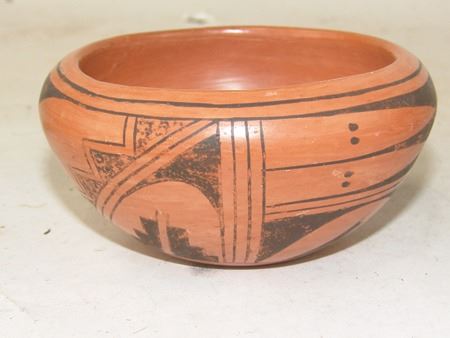 Early/Mid 1900s, Includes an older polychrome bowl (small stress crack) and a black-on-red vase with traditional avian motif. Very good condition. 2-1/4" x 5" & 4-5/8" x 3"