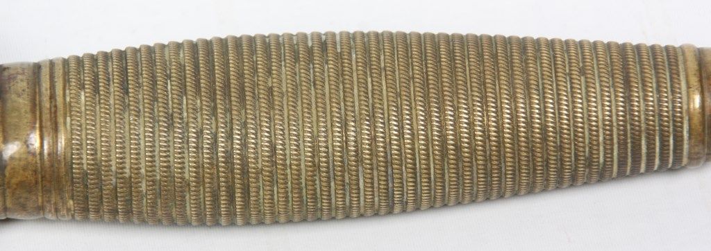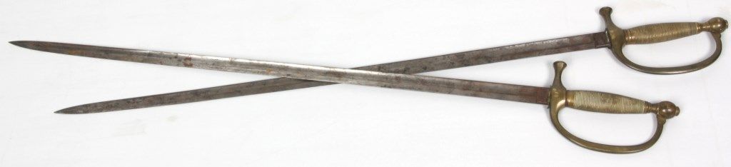 2 Horstmann's Infantry Model Swords. 28 in. long steel single fuller blades signed Horstmann's Phila. on one and Hortsmann's on the other, both have brass hilts with D-shaped hand guard, wire wrapped handles and domical formed pommels. overall length 34 in. Has some light surface rusting and tarnish to the blades and light grooves to the edges.