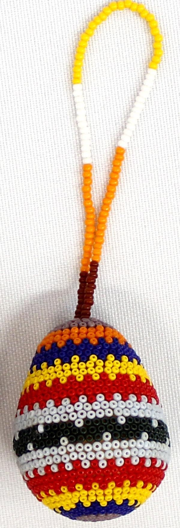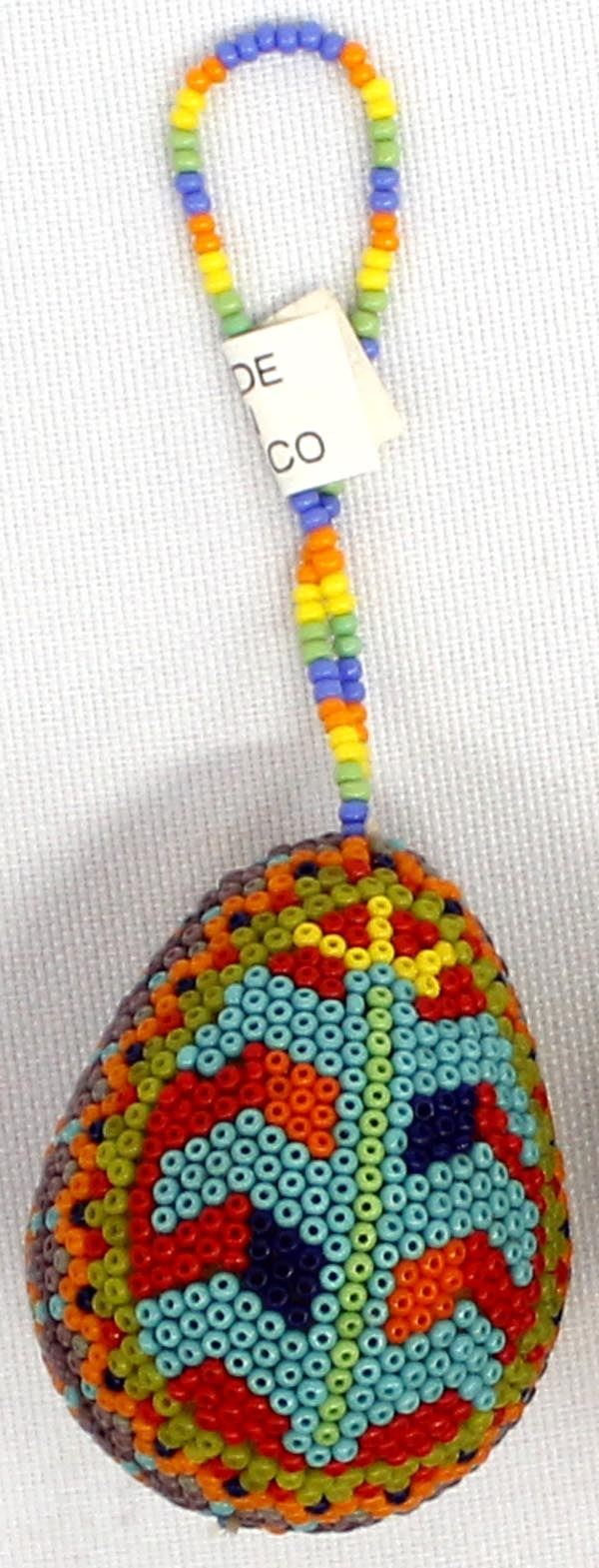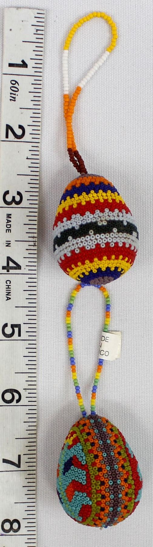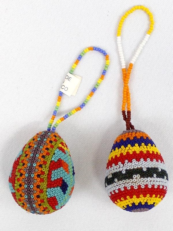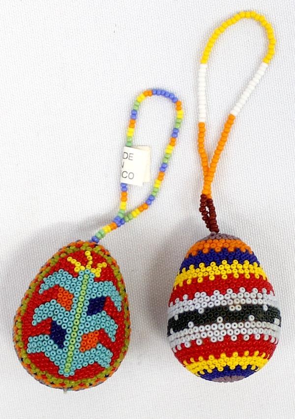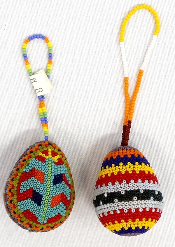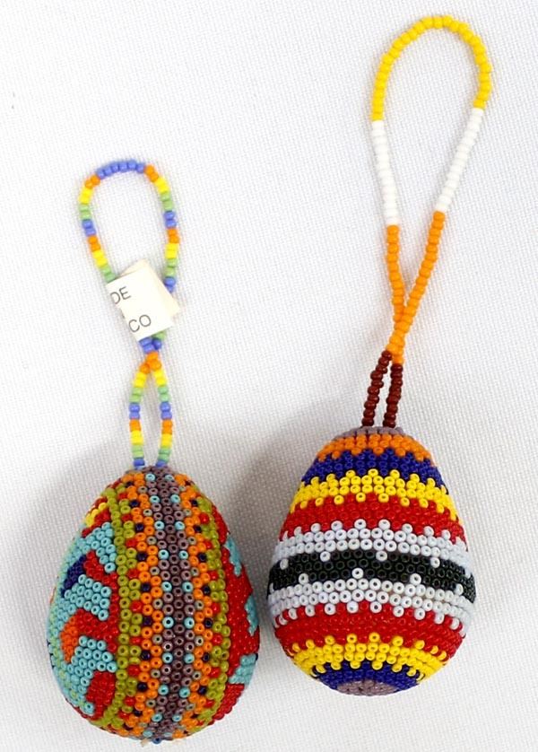 2 Huichol Beaded Eggs, measure 1.5''L, FYI: ''The Huichol have a long history of beading, making the beads from clay, shells, corals, seeds and more and using them to make jewelry and to decorate bowls and other items. The ''modern'' beadwork usually consists of masks, gourds, and wood sculptures covered in small, brightly colored commercial beads fastened individually with wax and resin.''