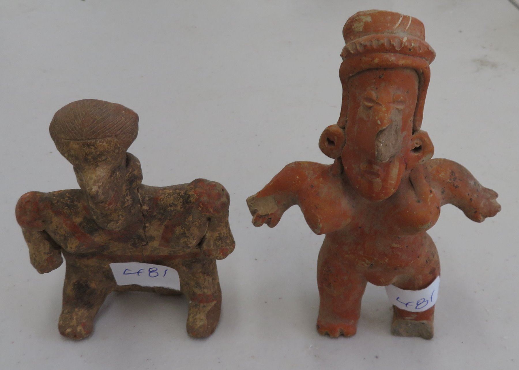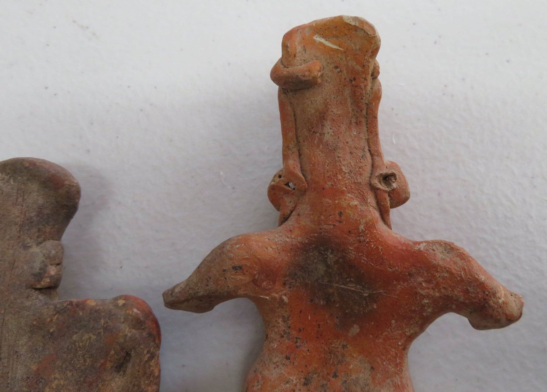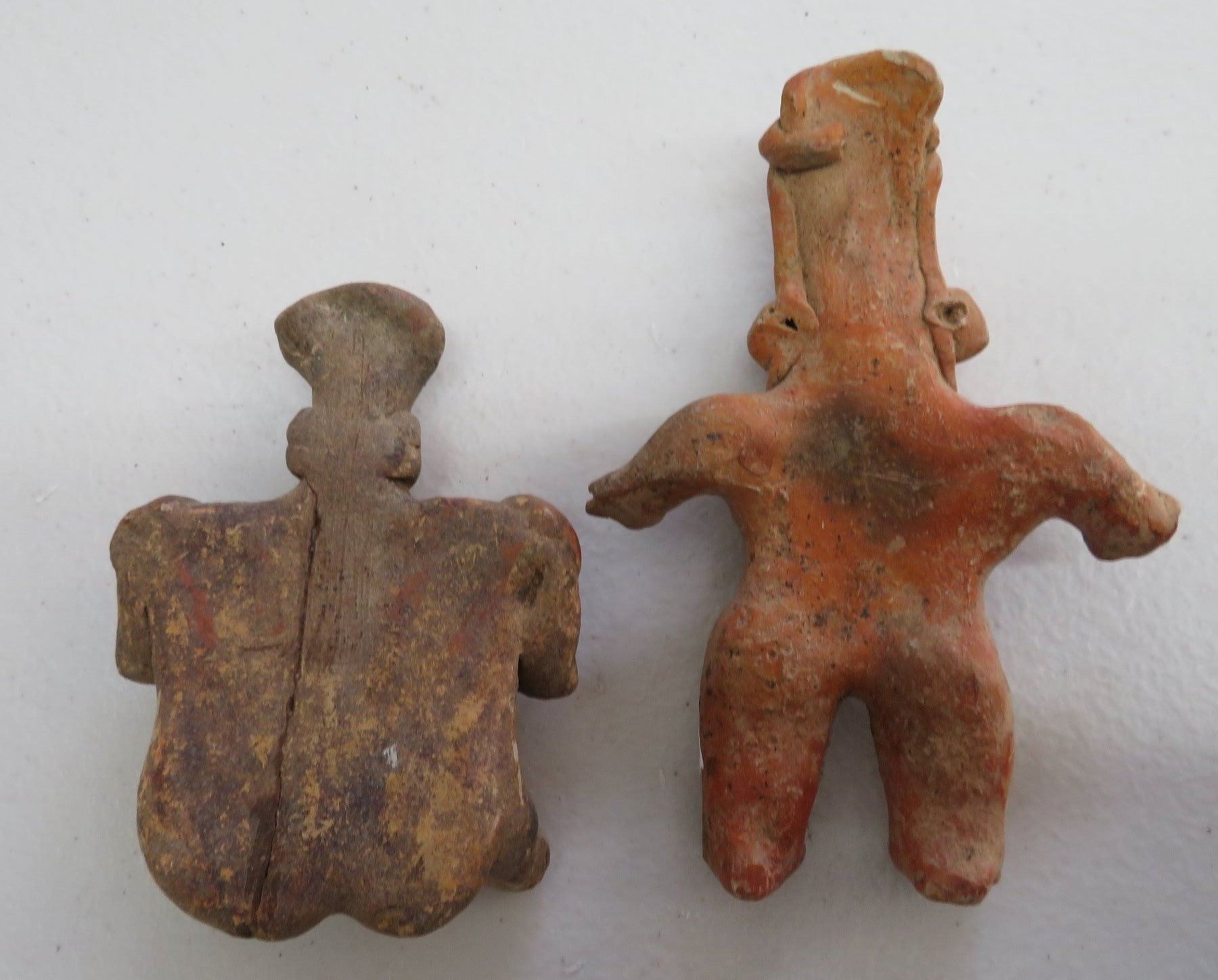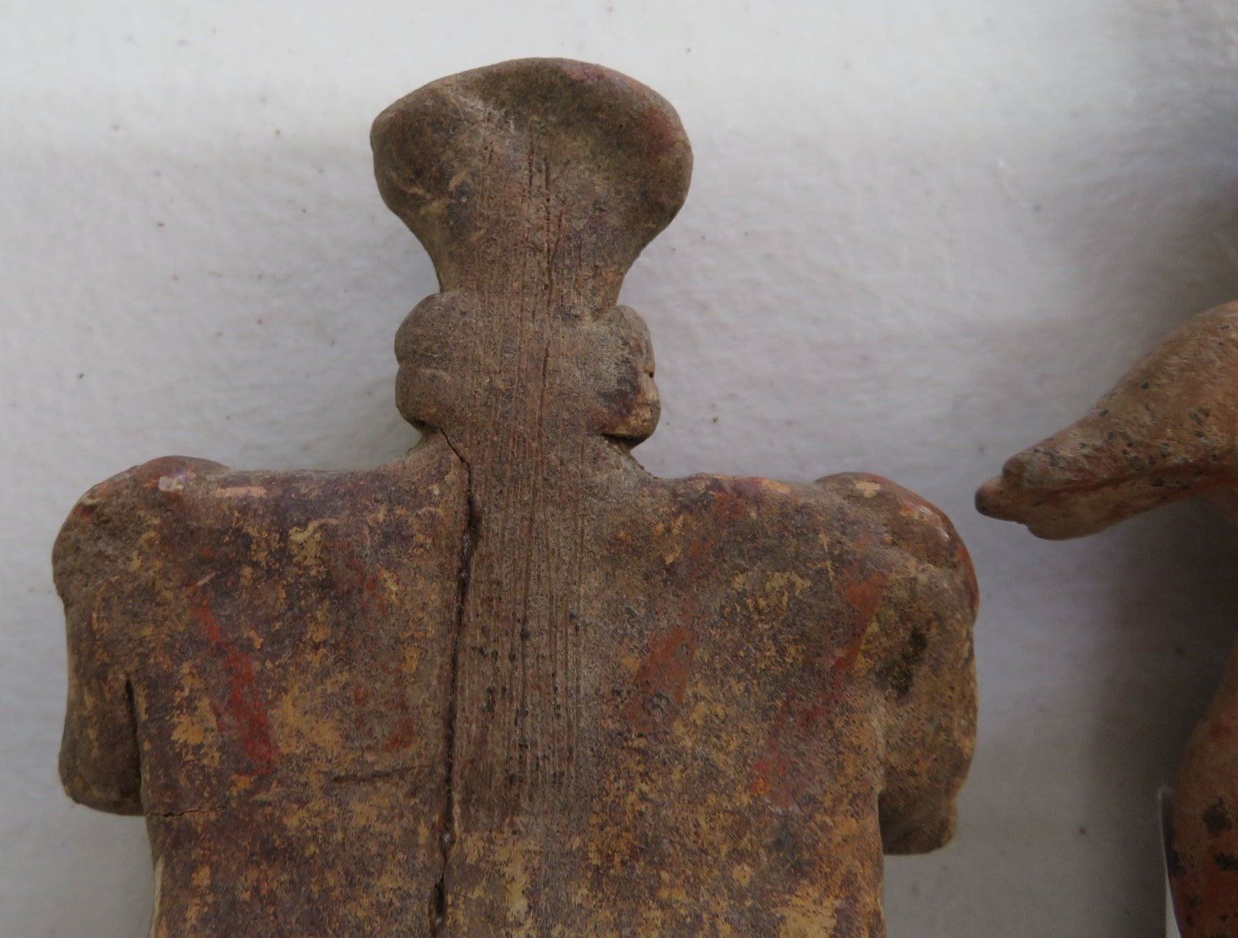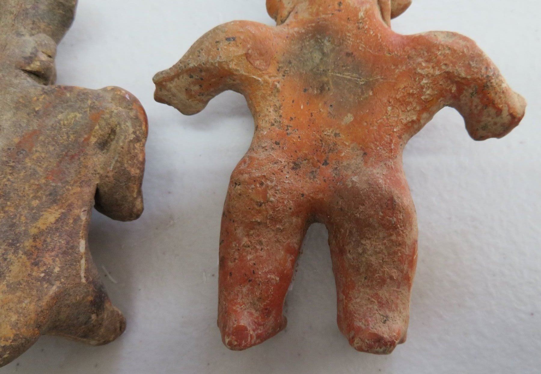 2 Human Pre-Columbian Figures, pre-Columbian items. Made of clay and paint, the largest measures 5". Jalisco, Mexico. Bad nose chip. Condition: Wear to foot and nose, see images. Shipping: $20.00 w/insurance and signature.
