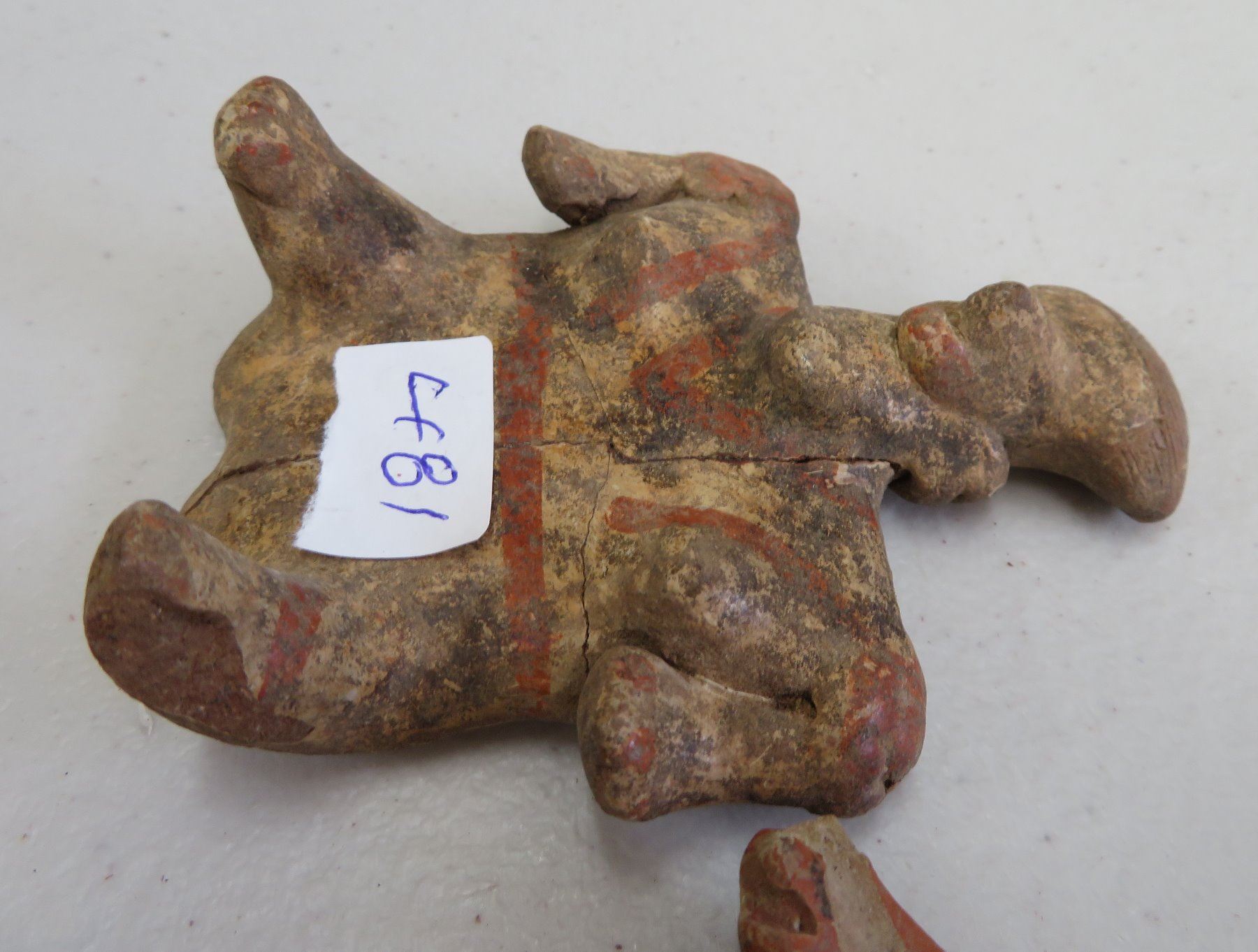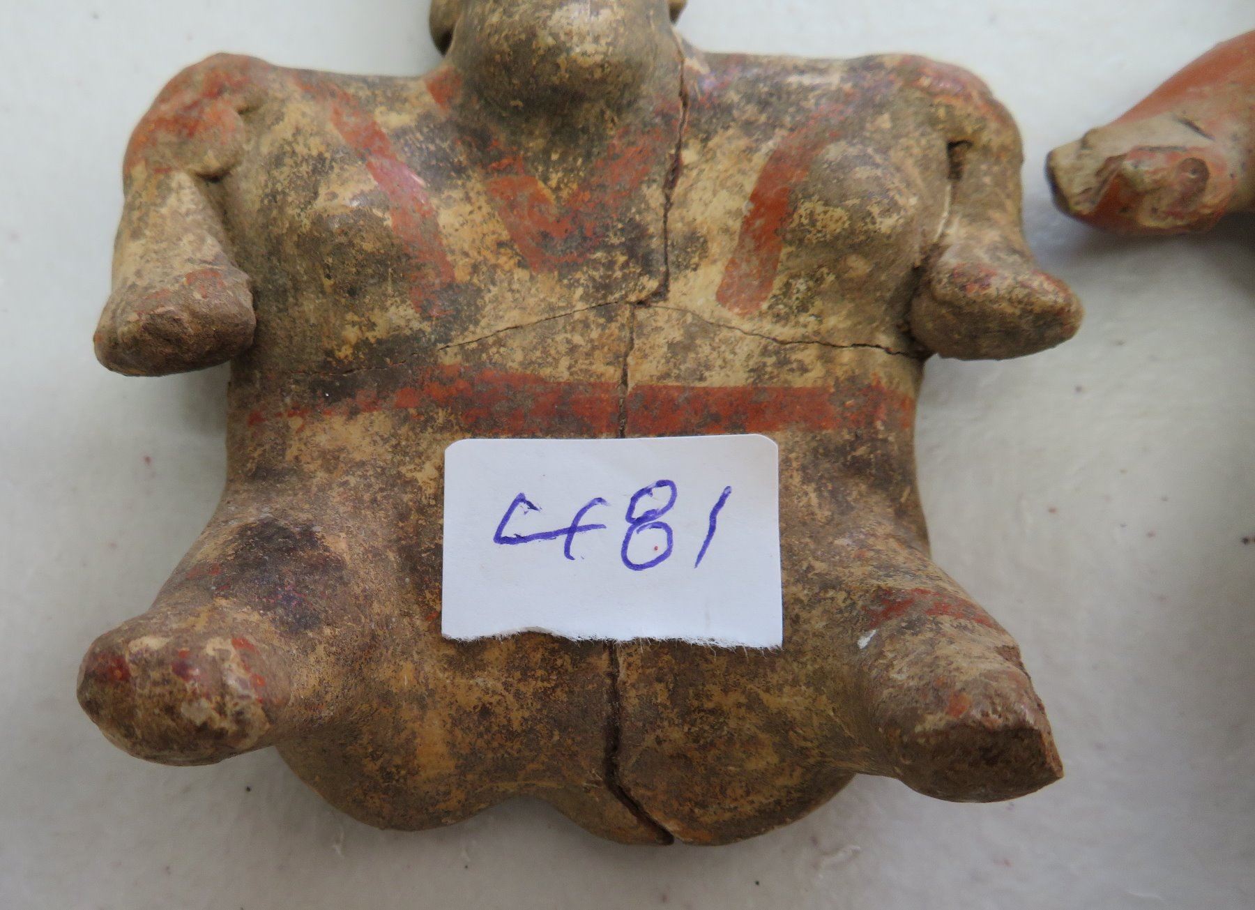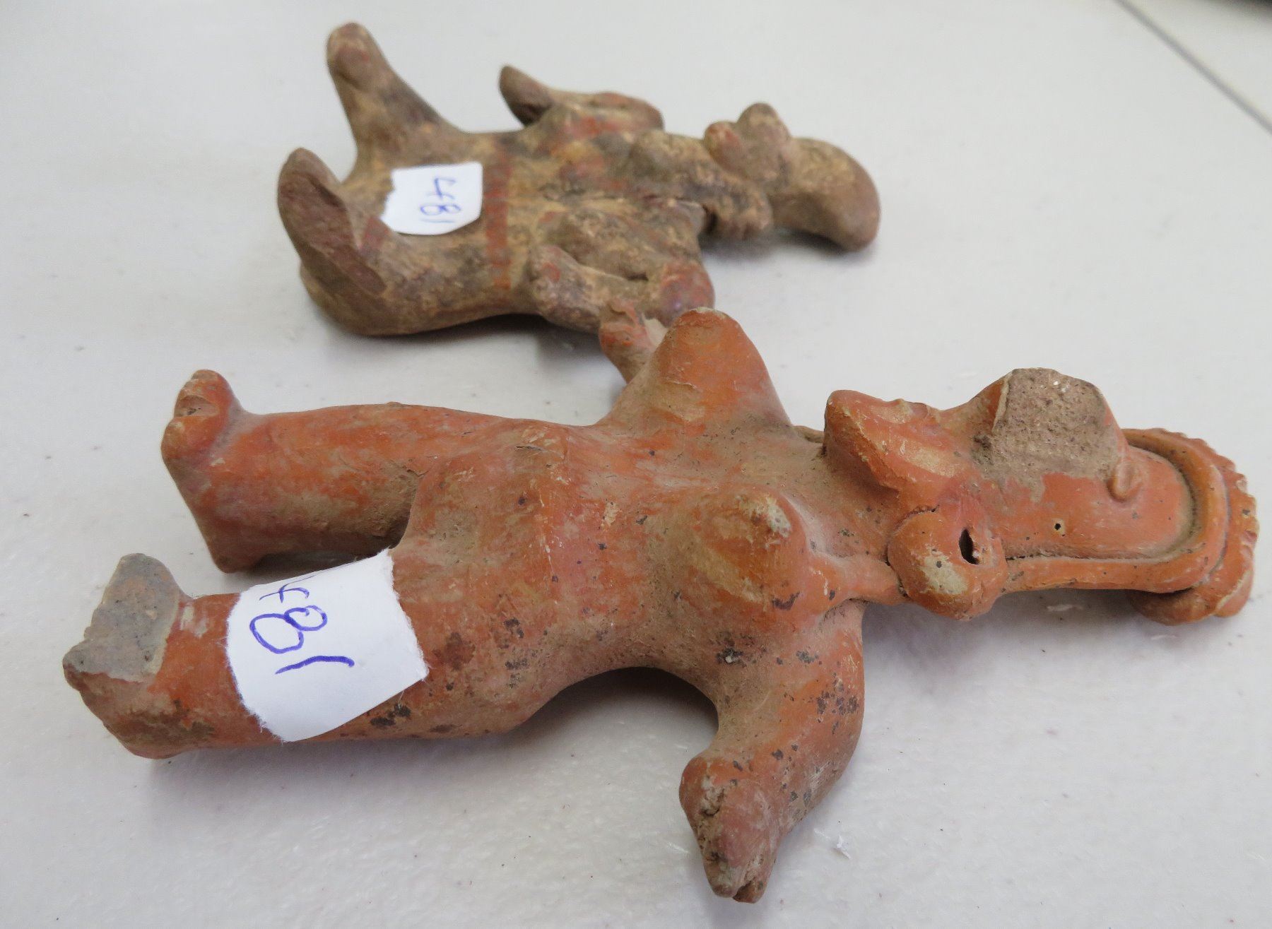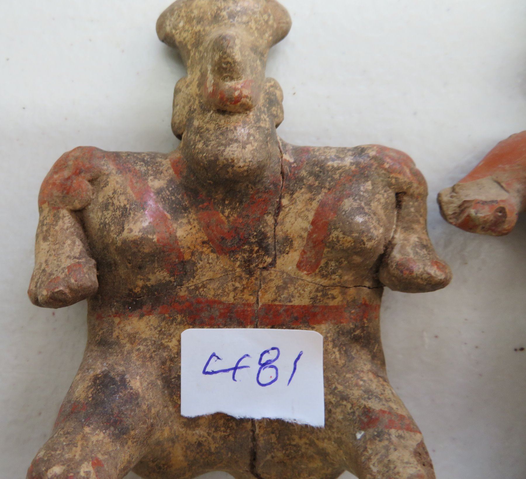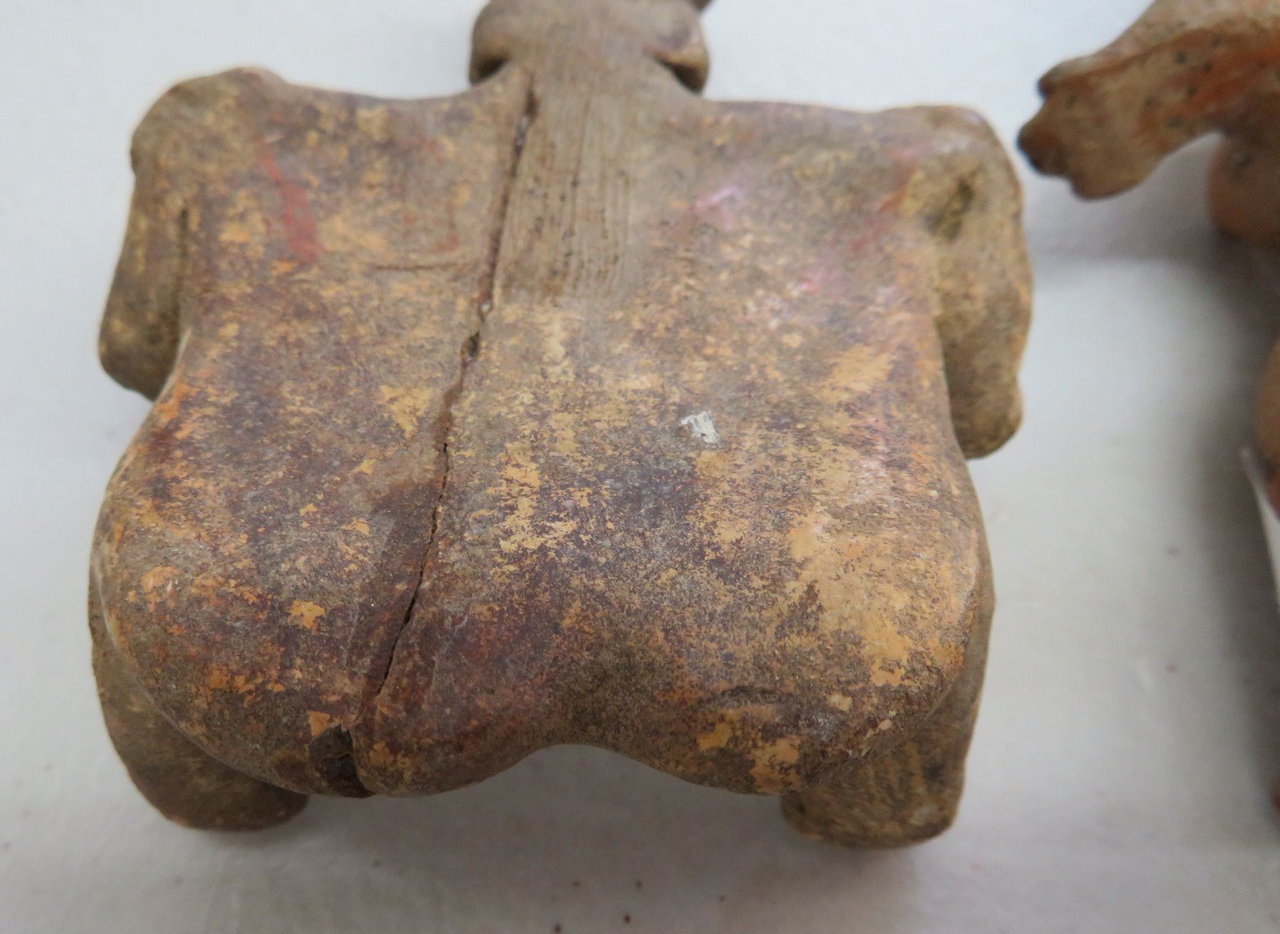 2 Human Pre-Columbian Figures, pre-Columbian items. Made of clay and paint, the largest measures 5". Jalisco, Mexico. Bad nose chip. Condition: Wear to foot and nose, see images. Shipping: $20.00 w/insurance and signature.