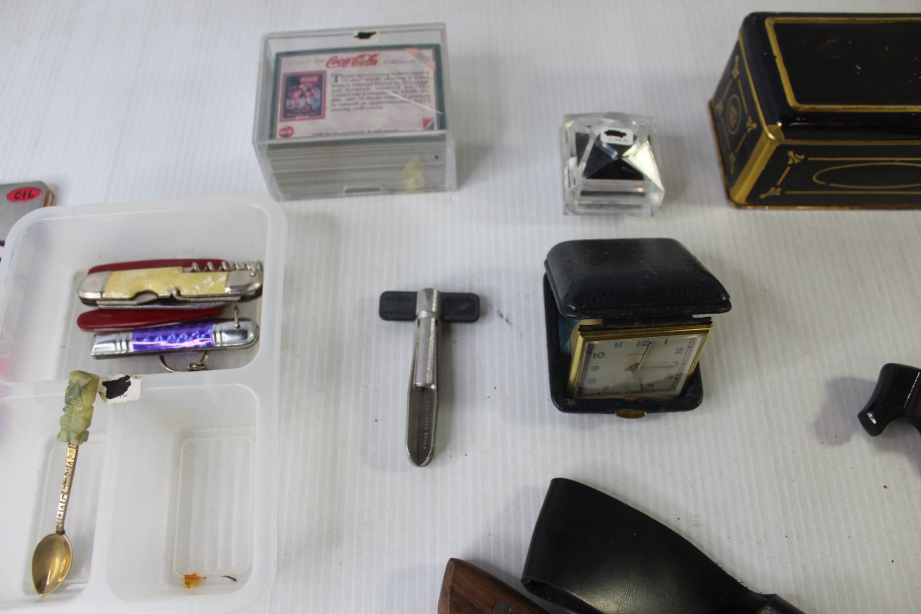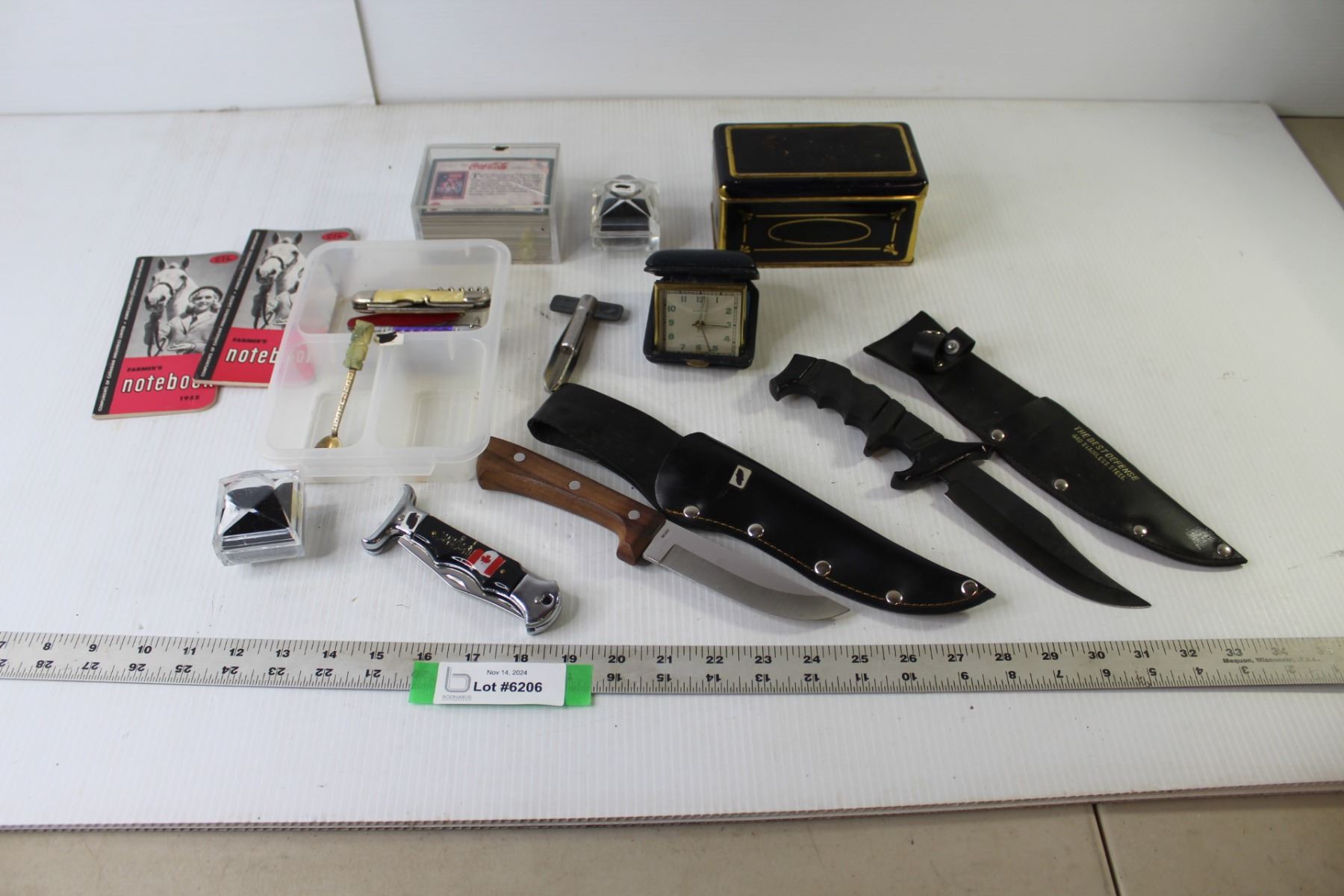 (2) Hunting Knives With Sheathes, Assorted Vintage/Antique Items (Coca-Cola Collector Cards, Pocket Knives, Tin, Jewelry Boxes, Compact Clock, Misc.)