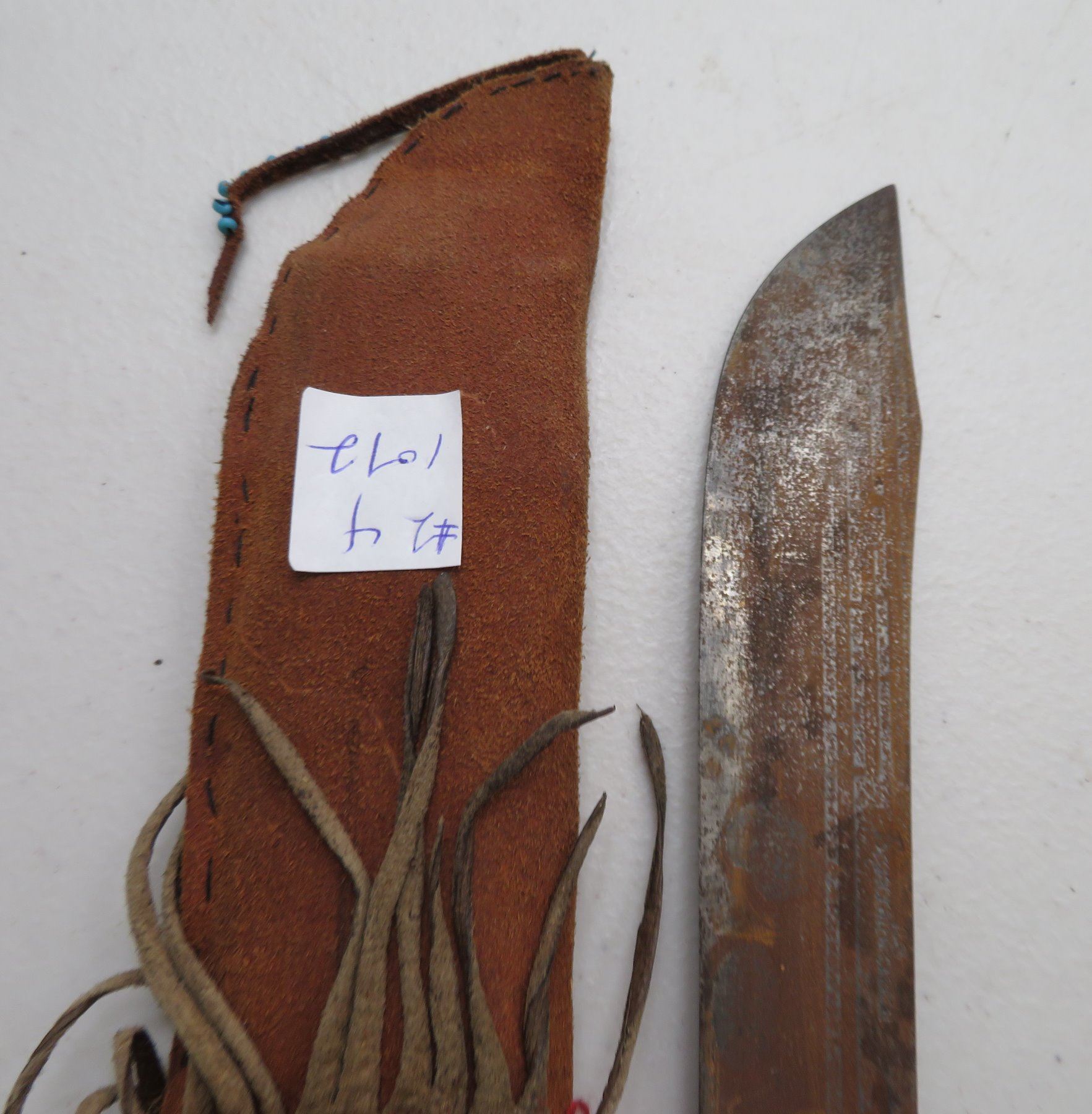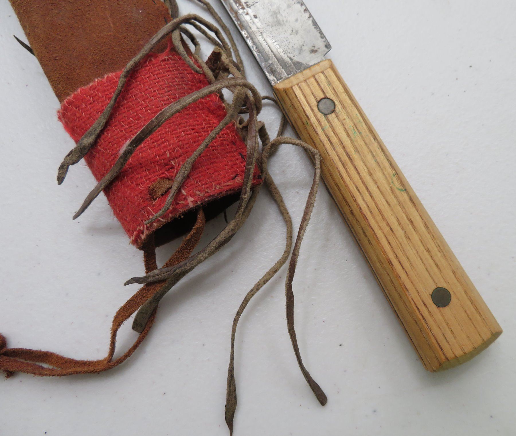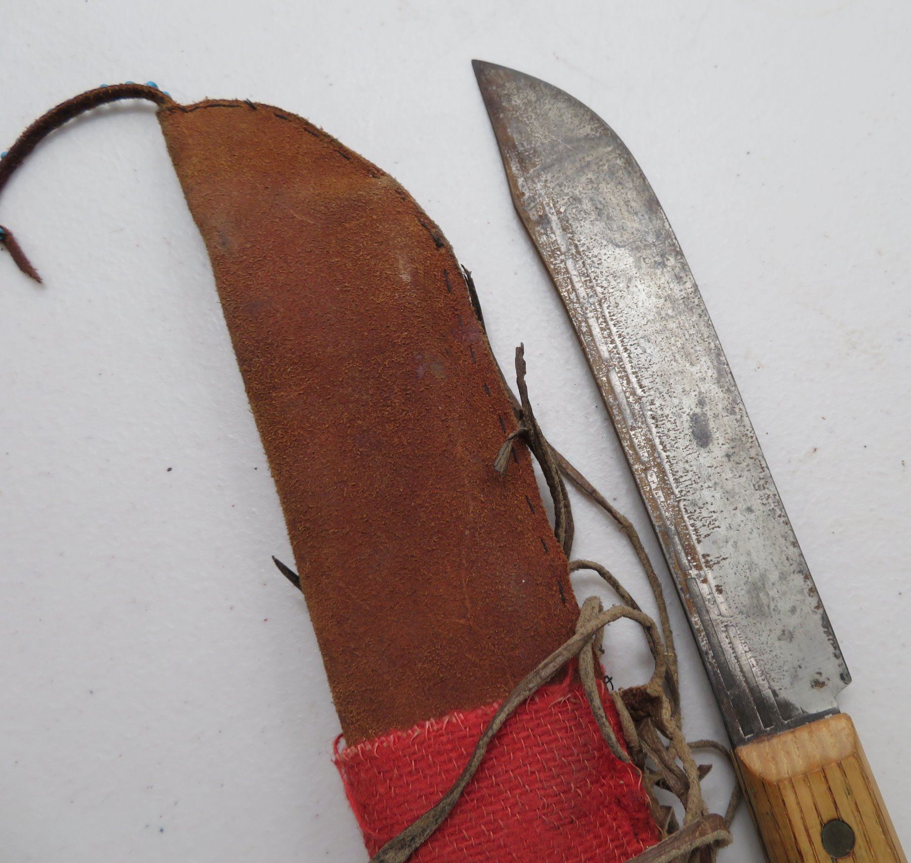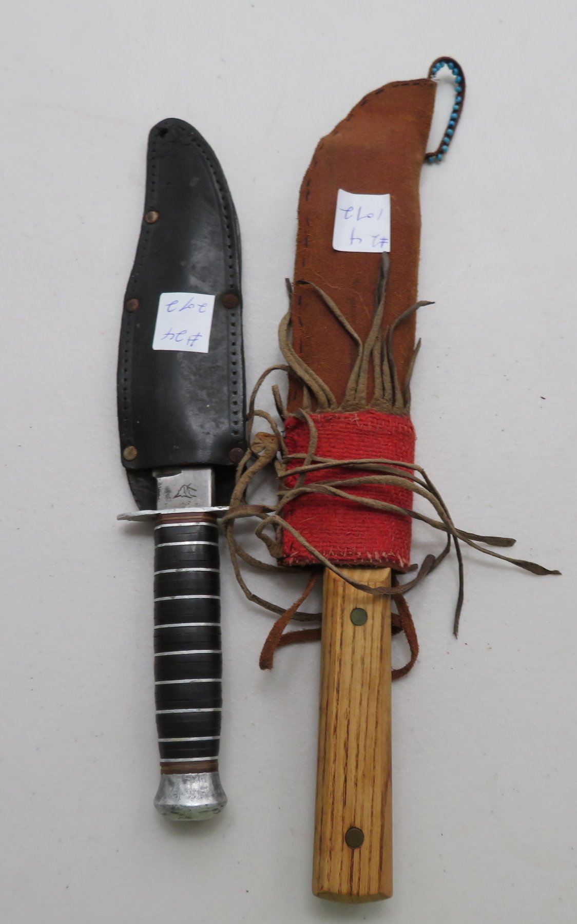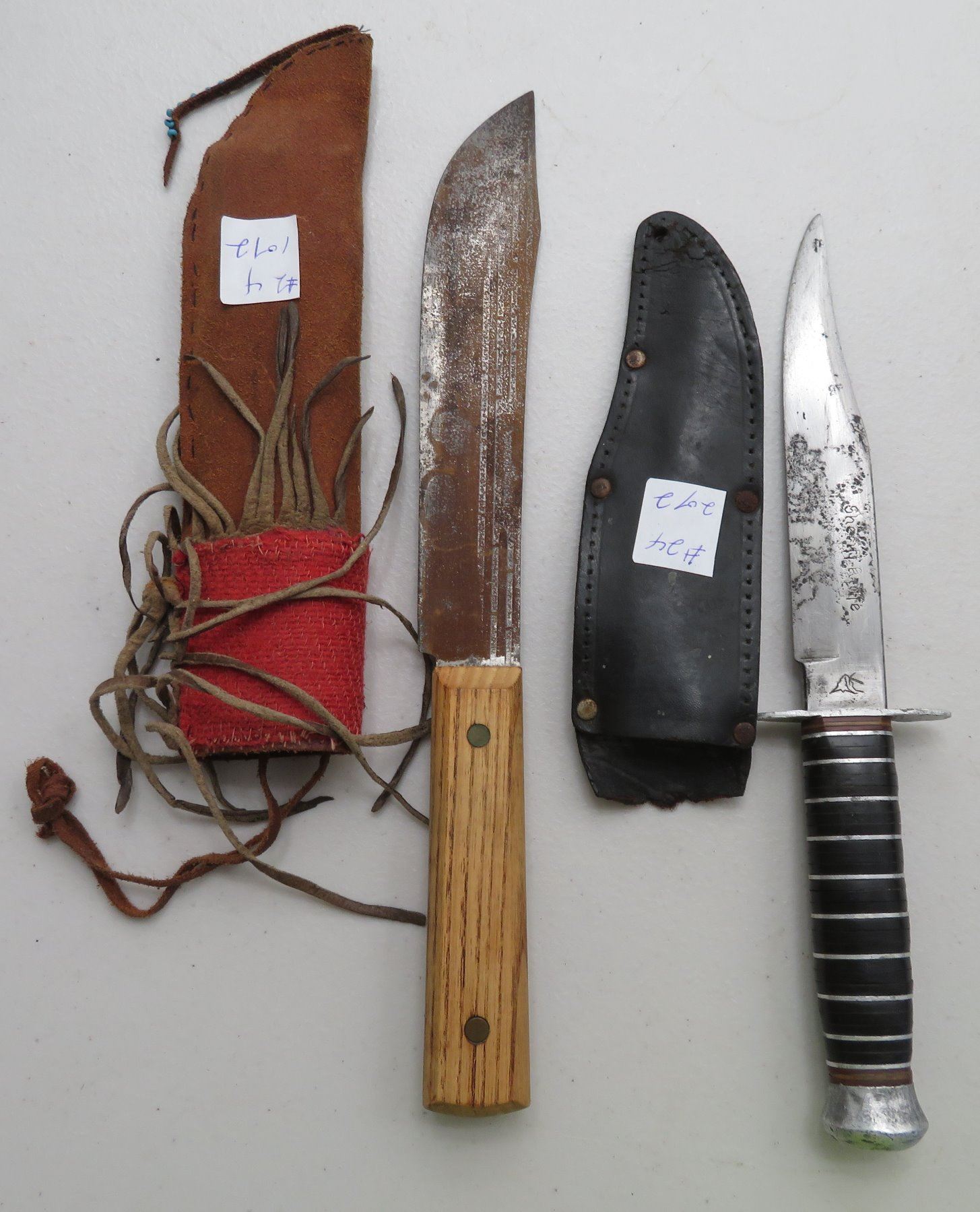 2 Hunting Knives, early 20th century items. Made of wood, leather, steel, the largest measures 13" and the other is 11". Smaller knife is German. Black knife reads sheriff knife on blade. Brown knife is an Indian trade knife. Condition: Worn, some rust, see images. Shipping: $30.00 w/insurance and signature, due to size.