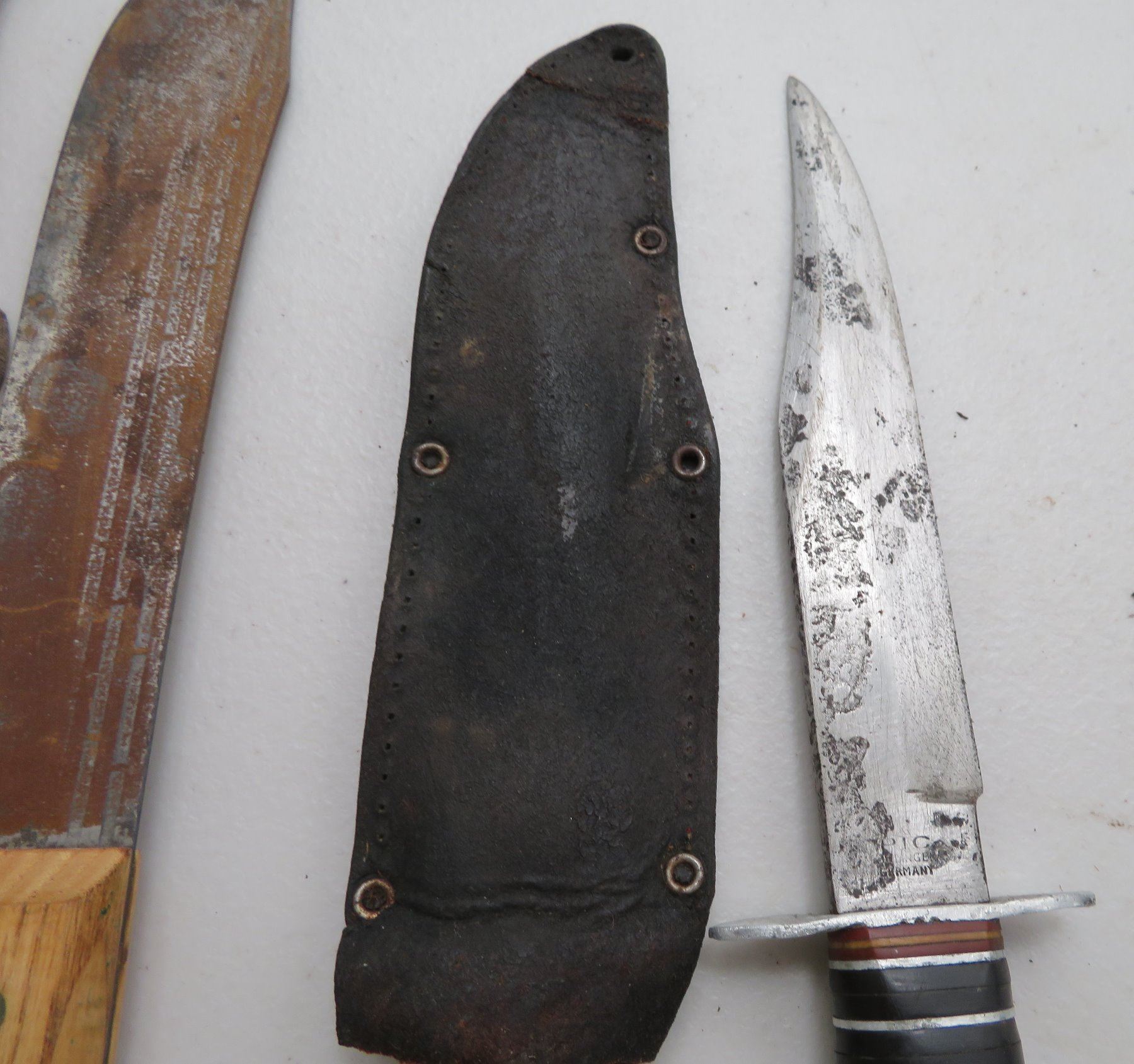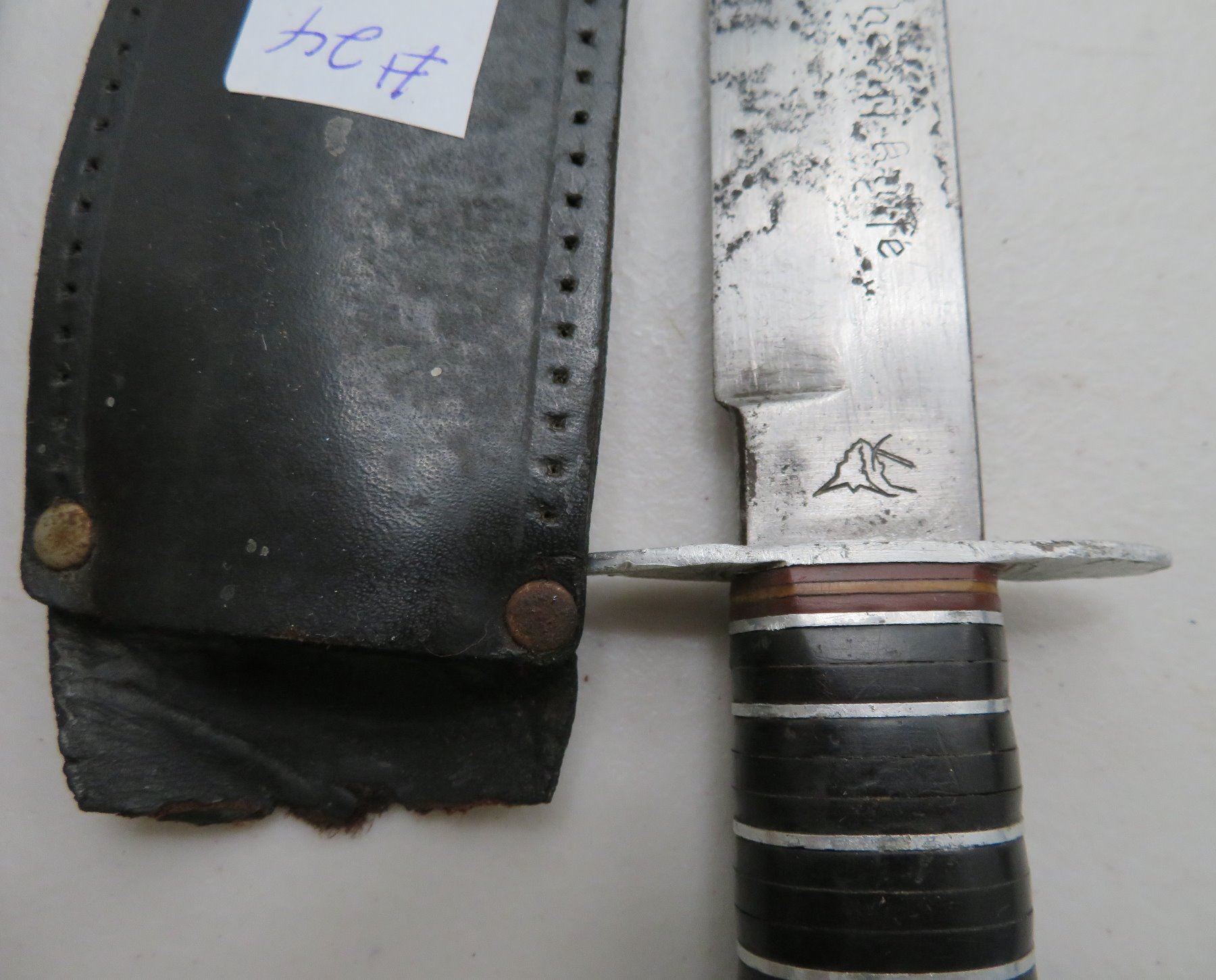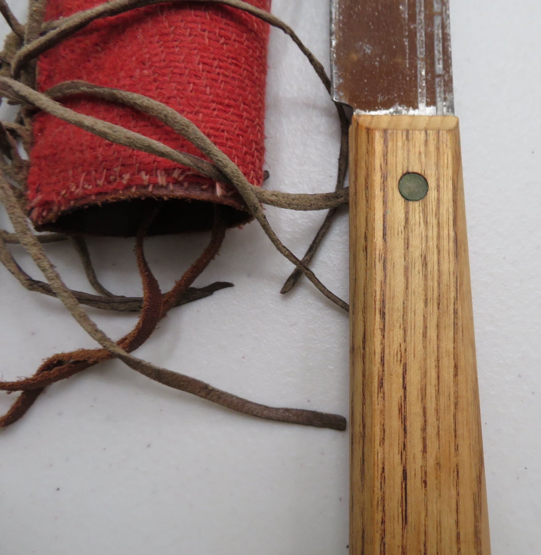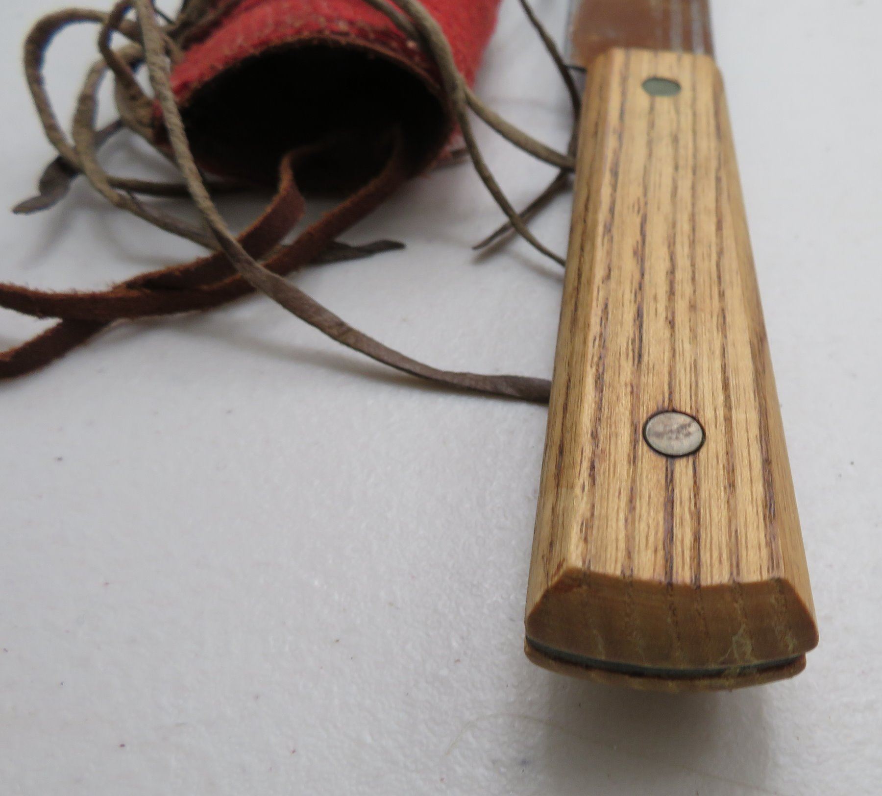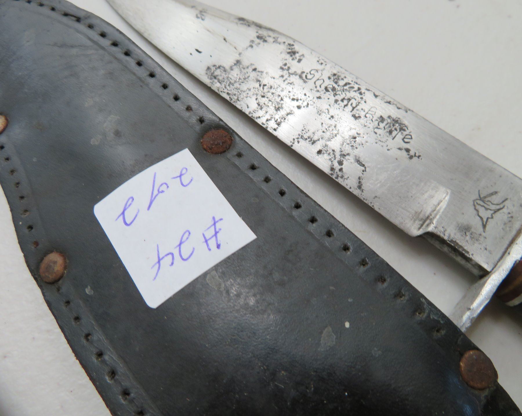 2 Hunting Knives, early 20th century items. Made of wood, leather, steel, the largest measures 13" and the other is 11". Smaller knife is German. Black knife reads sheriff knife on blade. Brown knife is an Indian trade knife. Condition: Worn, some rust, see images. Shipping: $30.00 w/insurance and signature, due to size.