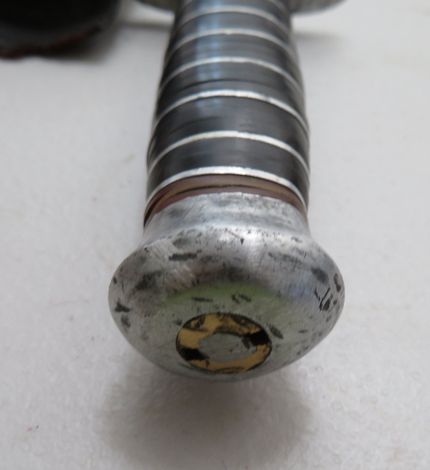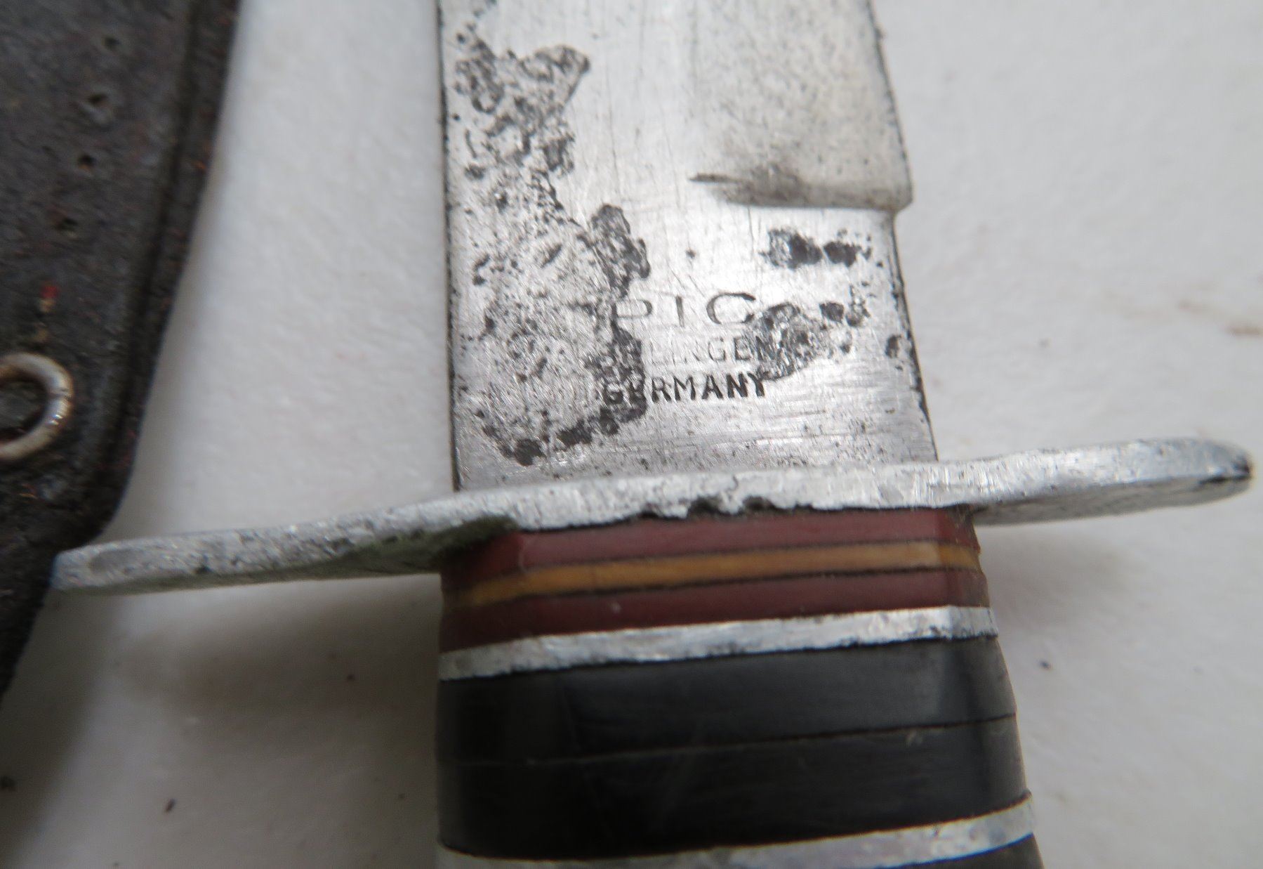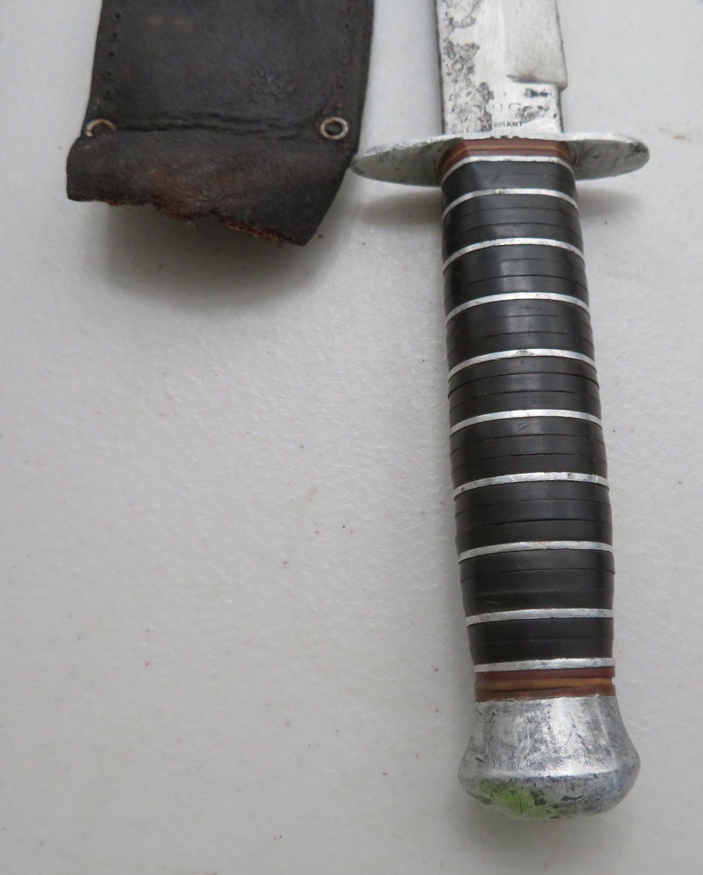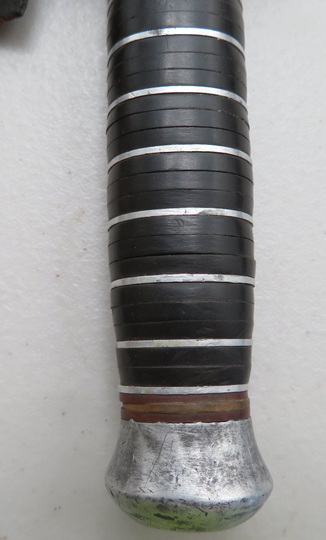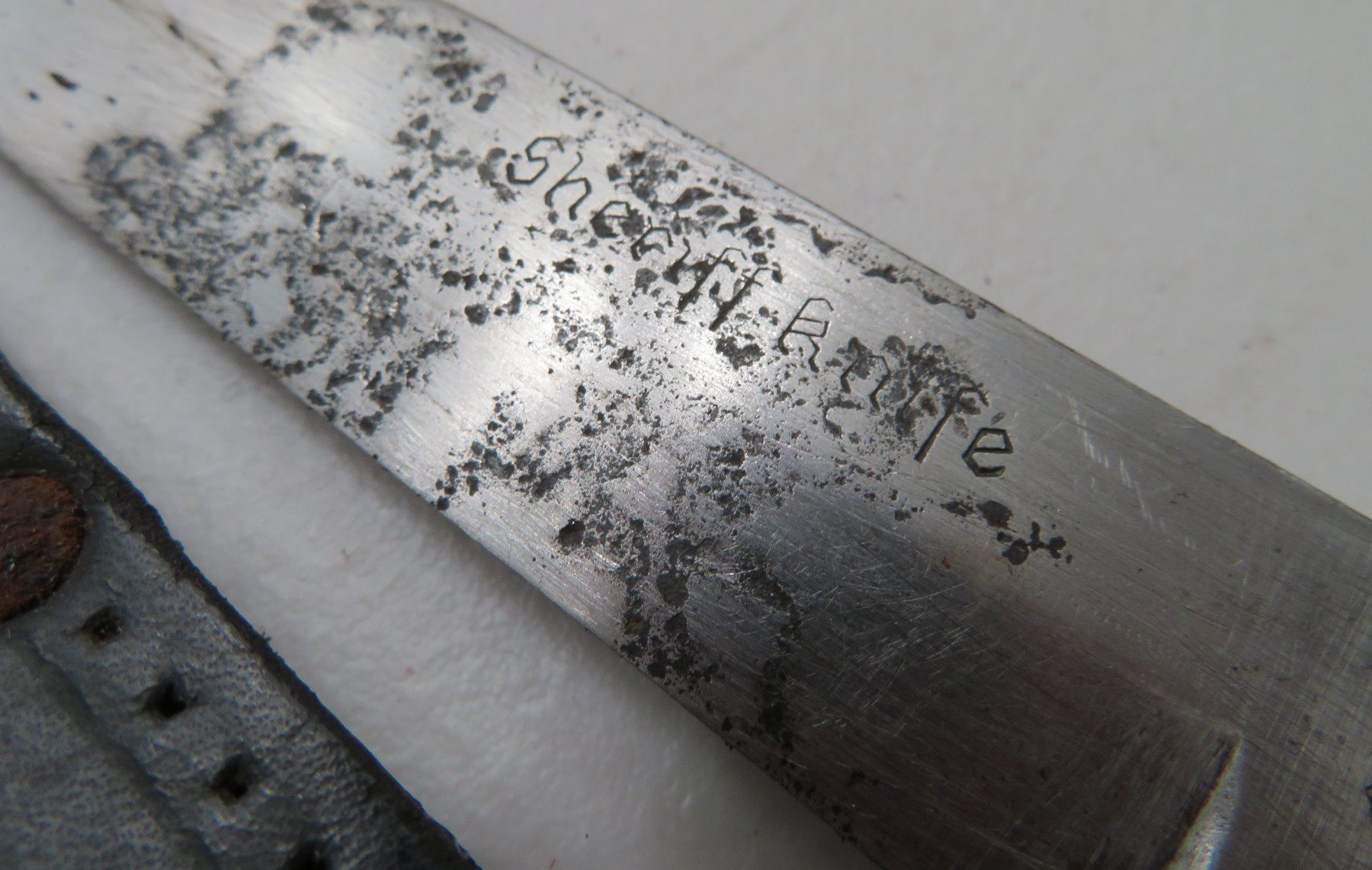 2 Hunting Knives, early 20th century items. Made of wood, leather, steel, the largest measures 13" and the other is 11". Smaller knife is German. Black knife reads sheriff knife on blade. Brown knife is an Indian trade knife. Condition: Worn, some rust, see images. Shipping: $30.00 w/insurance and signature, due to size.