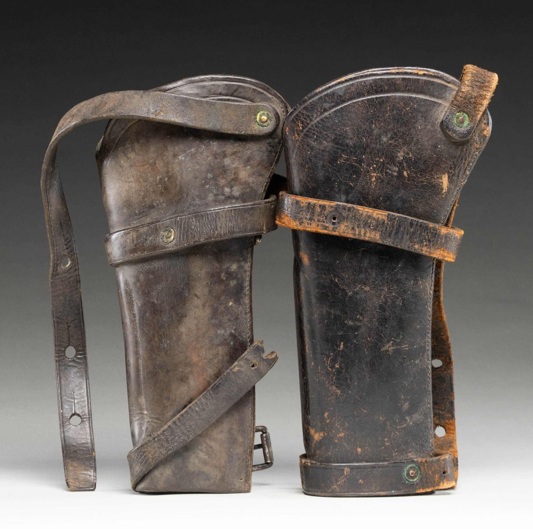 2 US M1885 1st pattern bridle leather US Cavalry carbine boots measuring about 12" in length. Both boots are marked "ROCK ISLAND ARSENAL" on one side and have regimental stampings above. CONDITION: all buckles and straps are present but the bottom strap on one has lost the tip. Leather shows expected wear. 1 rivet is missing. (02-25123/BF). $300-500.