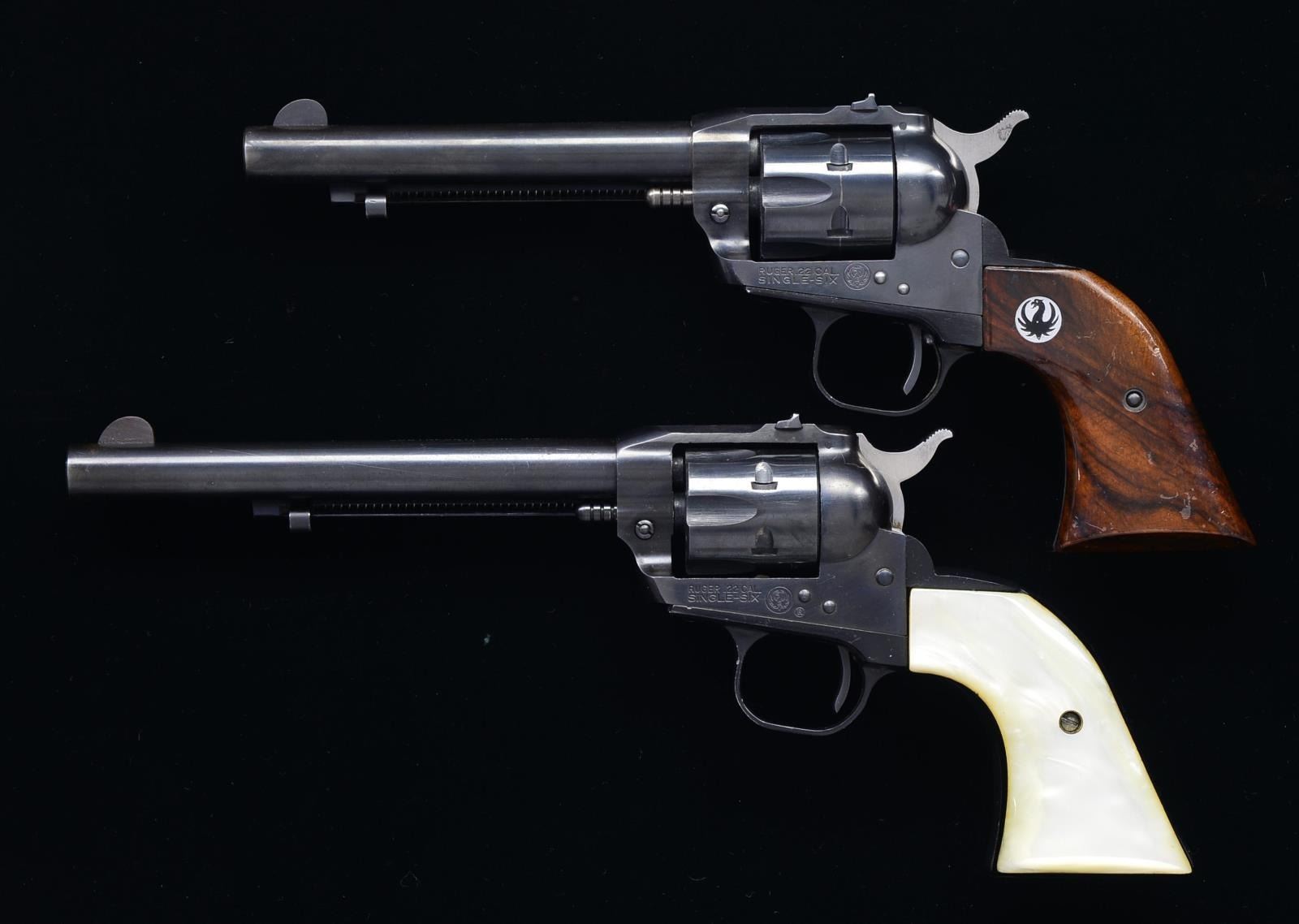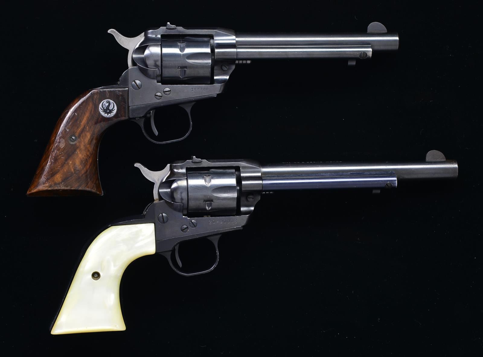 BOTH: cal. 22 S, L, LR. 1) S# 20-90008. Bbl. 6 1/2" w/out warning, fixed sights, alloy frame w/ simulated pearl grips. No Ruger medallions. CONDITION: very fine w/ nearly all original finish w/ some scratching on frame & light cleaned oxidation on bbl. Bright & shiny bore. Mechanically fine. (20-3871/MGM). 2) S# 158288. Bbl. 5 1/2". Standard configuration w/ iron sights, alloy frame w/ figured walnut grips w/ Ruger medallions. CONDITION: over 95% original blue, silvered on sharp edges & around muzzle. Fairly heavy drag mark on cyl. Grips w/ some dings & marks. Front frame screw missing. Shiny bore, mechanically good. (20-3872/MGM). BOTH MODERN. $500-800.