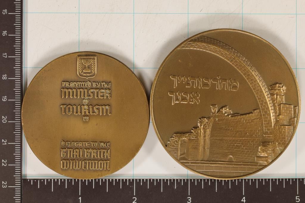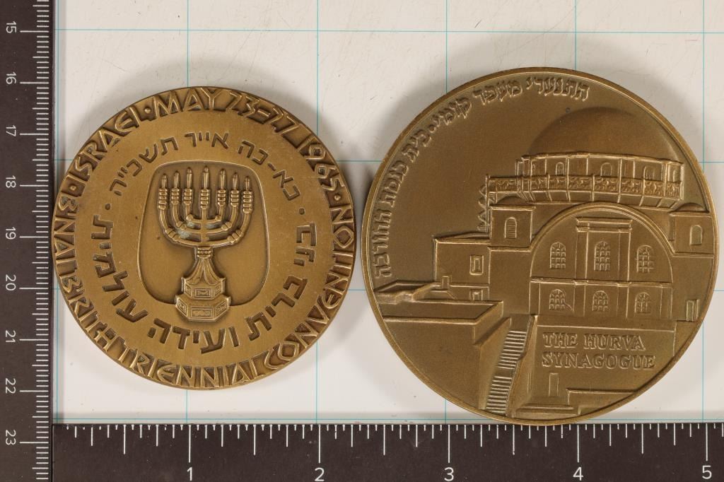 CONVENTION MEDAL AND 5 OZ. THE HURVA SYNAGOGUE, BOTH ARE EDGE MARKED. ONE MEDAL IS 2 3/4" AND THE OTHER IS 2 1/4"