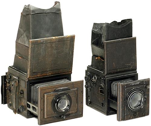 2 Ica SLR Cameras 1) Ica, Dresden. "Tudor Reflex", 1919, size 10 x 15 on plates, with Tessar 4,5/18 cm focal plane shutter 1/10-1/1000 sec., with cassette. - And: 2) Ica für Butcher's British Cameras. "Popular Pressmann", c. 1909, size 3 1/6 x 4 in., with Dallmeyer Pentac 2.9/6 in. focal plane shutter 1/15 - 1/1000 sec., focusing screen back.<Br>
