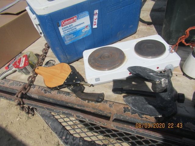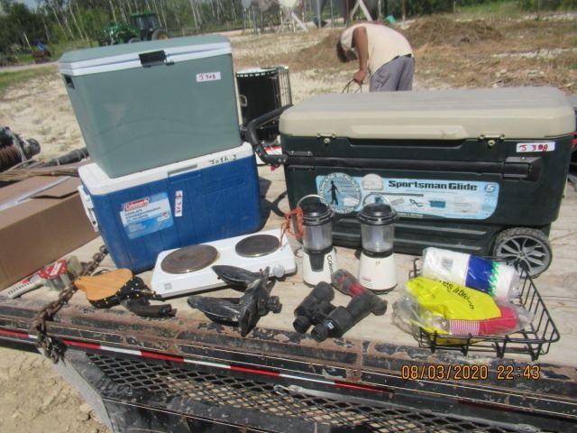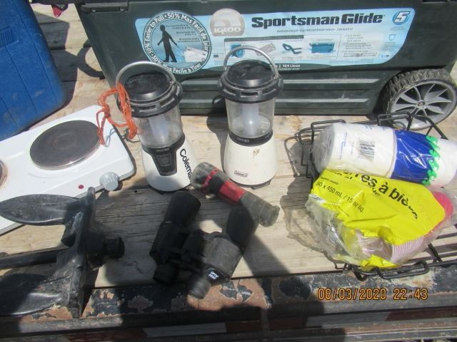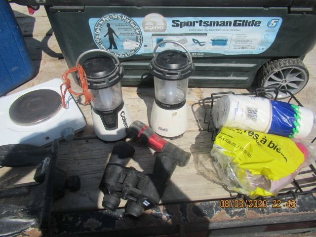 2 Igloo Portable Coolers, Colman Lantern Elec 2 Burner Hotplate, Bevail Anchor, Binoculars