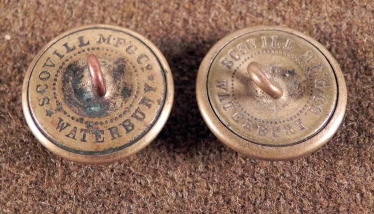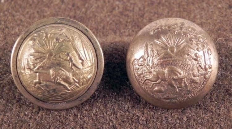 2 Civil War era Indiana State Antique Tunic Buttons in gilt * * Obverse: Buffalo in a field; one has horizontal groove stripes and lip, and the other is plain and roundedReverse: SCOVILL MF'G CO., WATERBURY; GODDARD & BROS, N.J.Diameter: 22 mmCondition: Very good, with minor surface wear, one with slightly bent shank