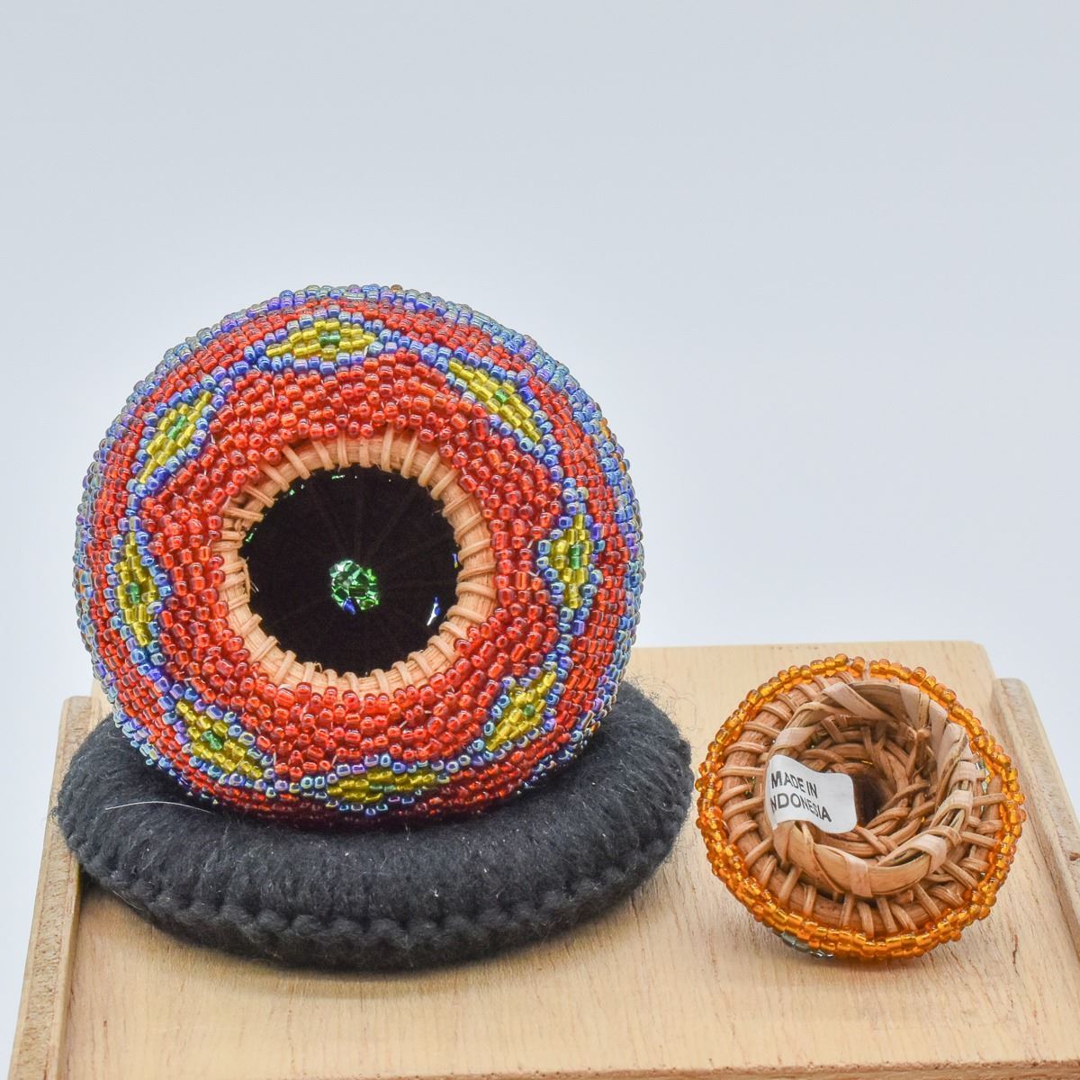 2 Indonesian Beaded Lidded Rattan Baskets, largest measures 3'' x 3.5'', baskets woven in Lombok, Indonesia and beadwork done in Bali, stunning colors