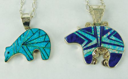 Early 2000s, Pair of bear shaped silver pendants both with fine opaline inlays. Very good condition. 24", 1-3/4" x 1-3/4" & 1-1/2" x 1-1/2"