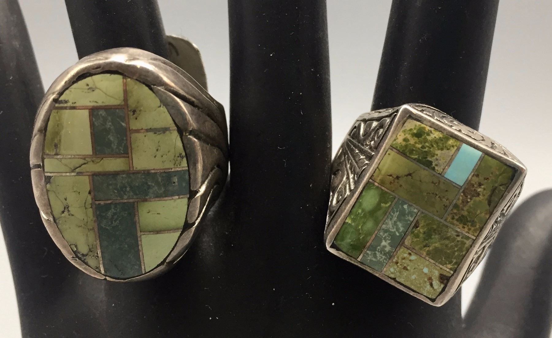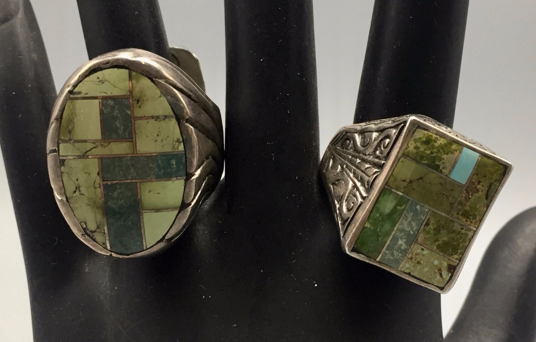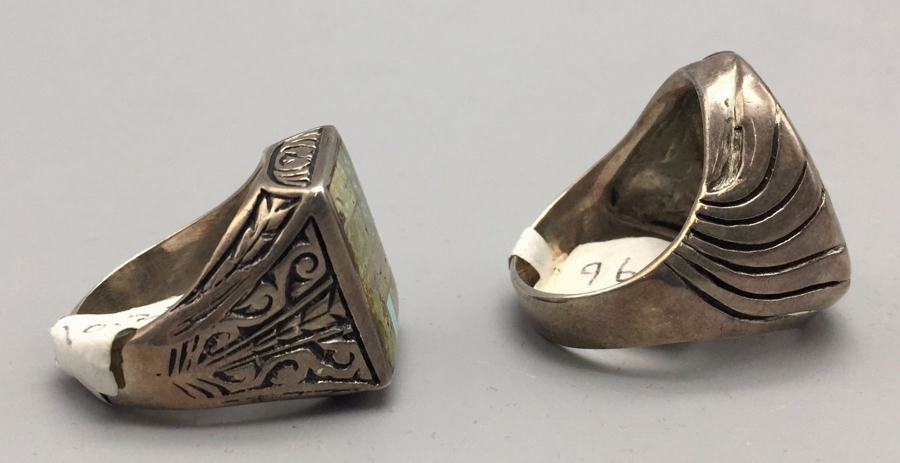 Maker: Unknown, both are hallmarked DR. Approx. Age: Fairly modern. Size: 10.5 and 11.75. Together they weigh 32.3g. Condition: Good, normal wear expected. Additional Info: Turquoise inlay set in sterling silver. Please look closely at the pictures - they are an important part of our description. Shipping: There will be a $5 handling / packaging fee for shipping this lot. The actual cost of postage will be added on top of that.