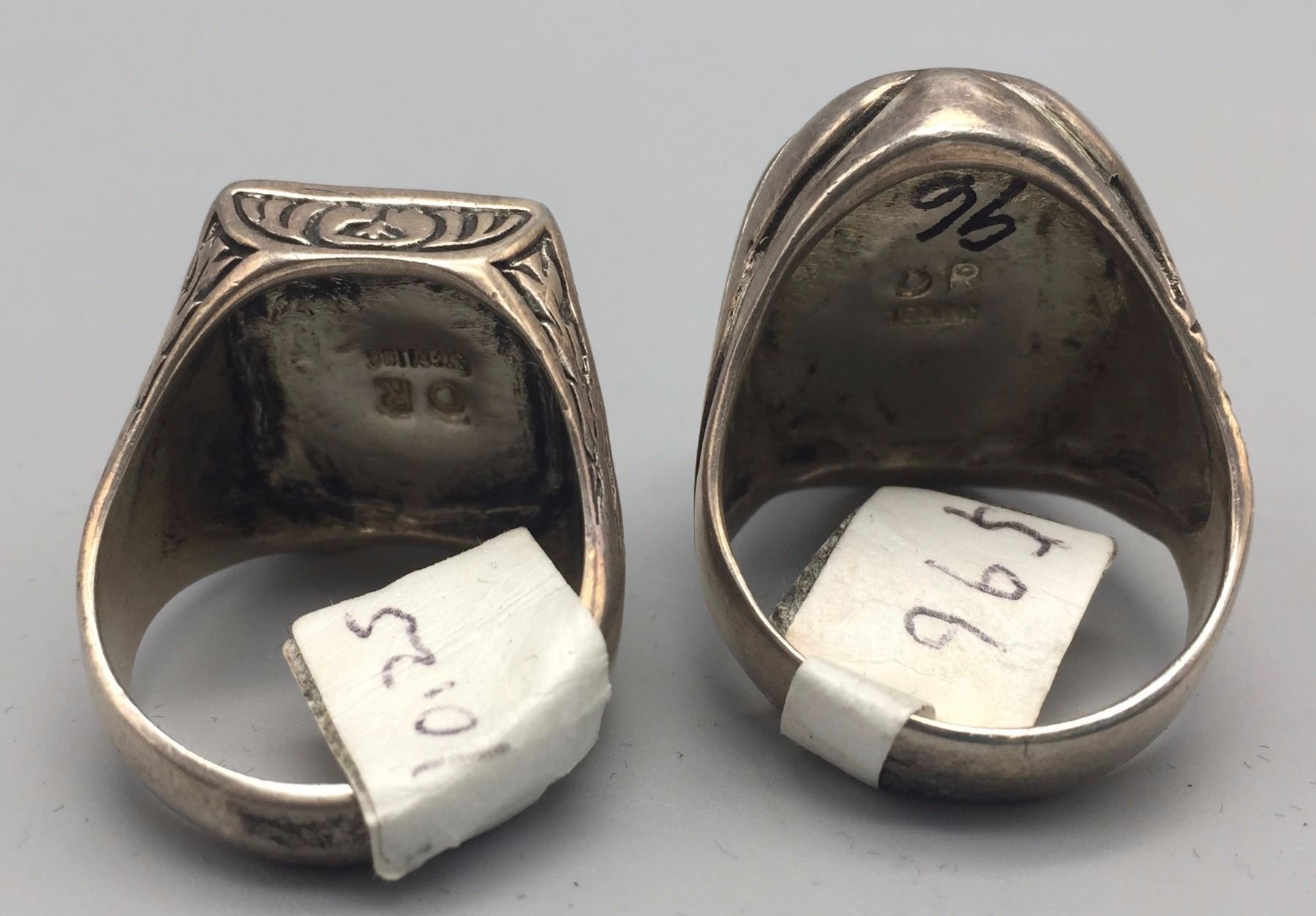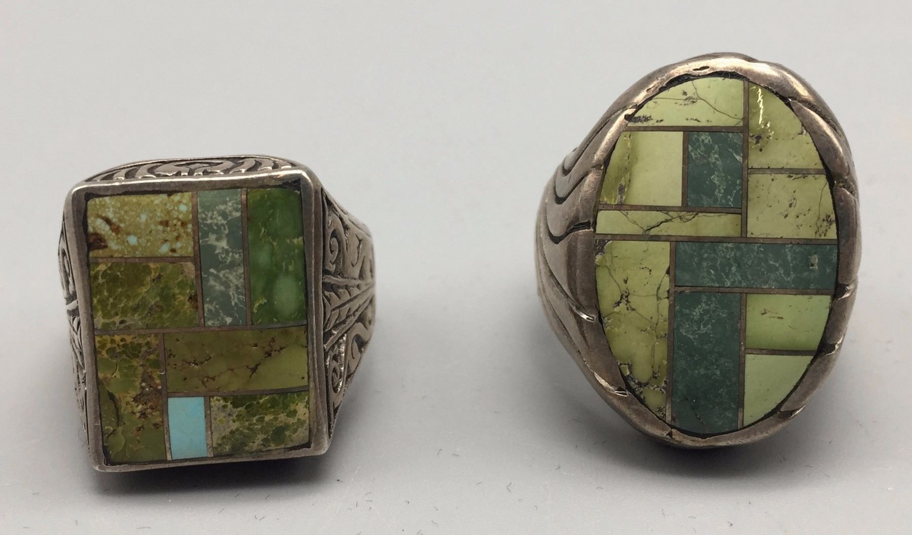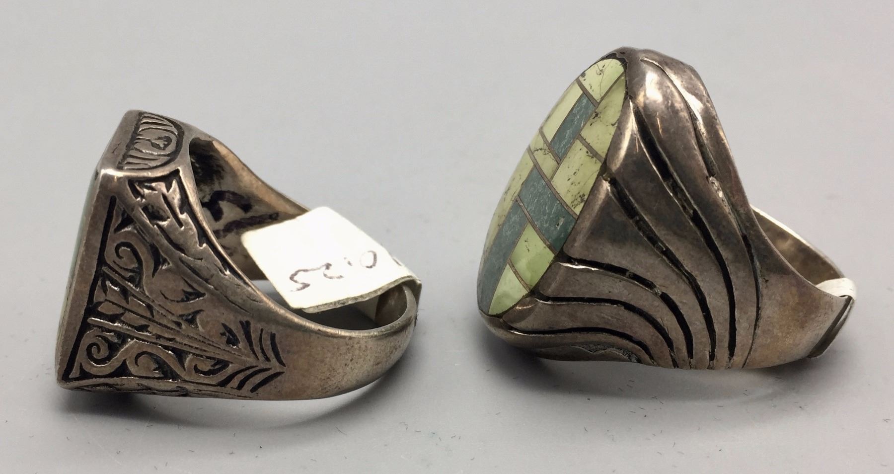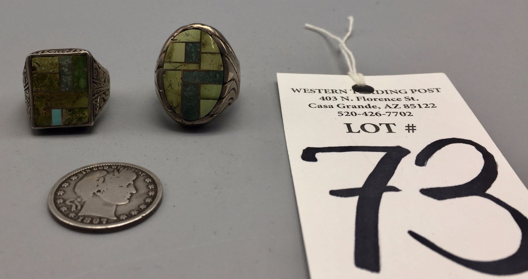 Maker: Unknown, both are hallmarked DR. Approx. Age: Fairly modern. Size: 10.5 and 11.75. Together they weigh 32.3g. Condition: Good, normal wear expected. Additional Info: Turquoise inlay set in sterling silver. Please look closely at the pictures - they are an important part of our description. Shipping: There will be a $5 handling / packaging fee for shipping this lot. The actual cost of postage will be added on top of that.