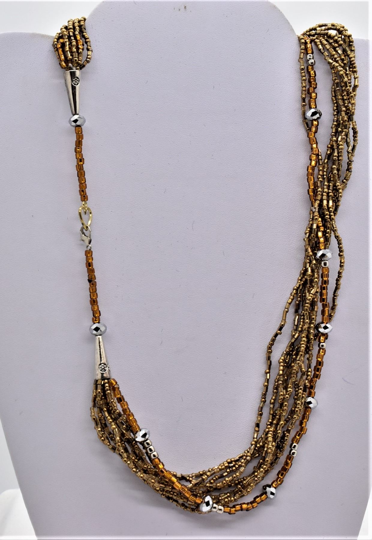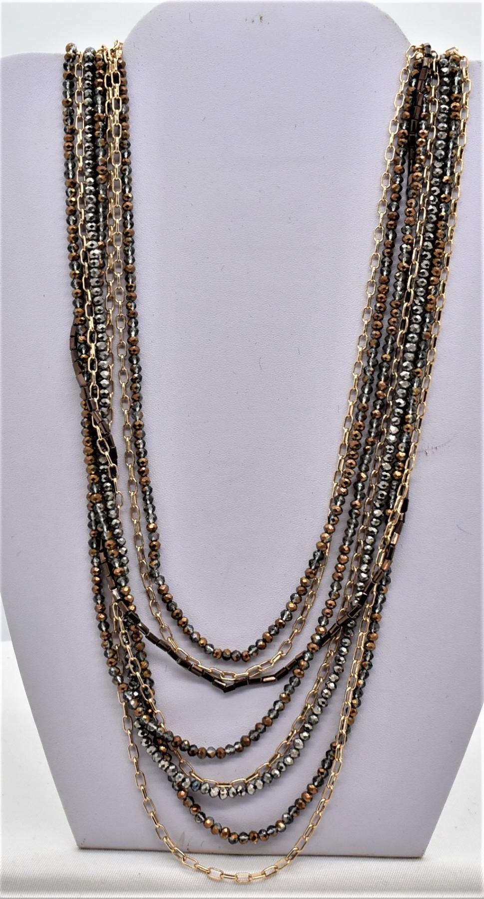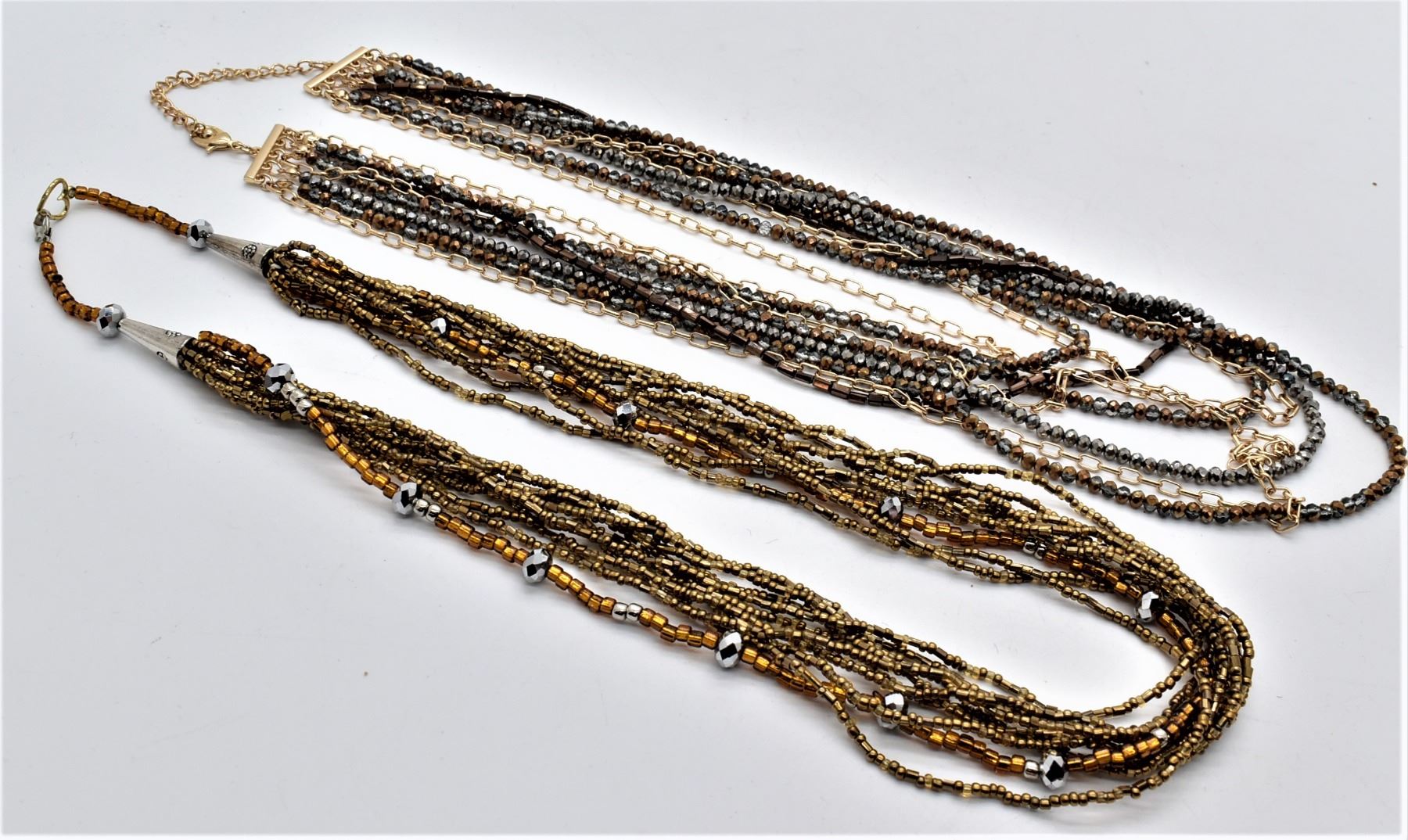2 Iridescent Bead Necklaces, includes 10 Strand Gold Tone Bead Necklace designed and beaded by Kathy Kills Thunder and 8 Strand Tiered Bead and Chain Necklace (longest strand measures 30''L end to end with a 3.25''L chain extender to shorten it)