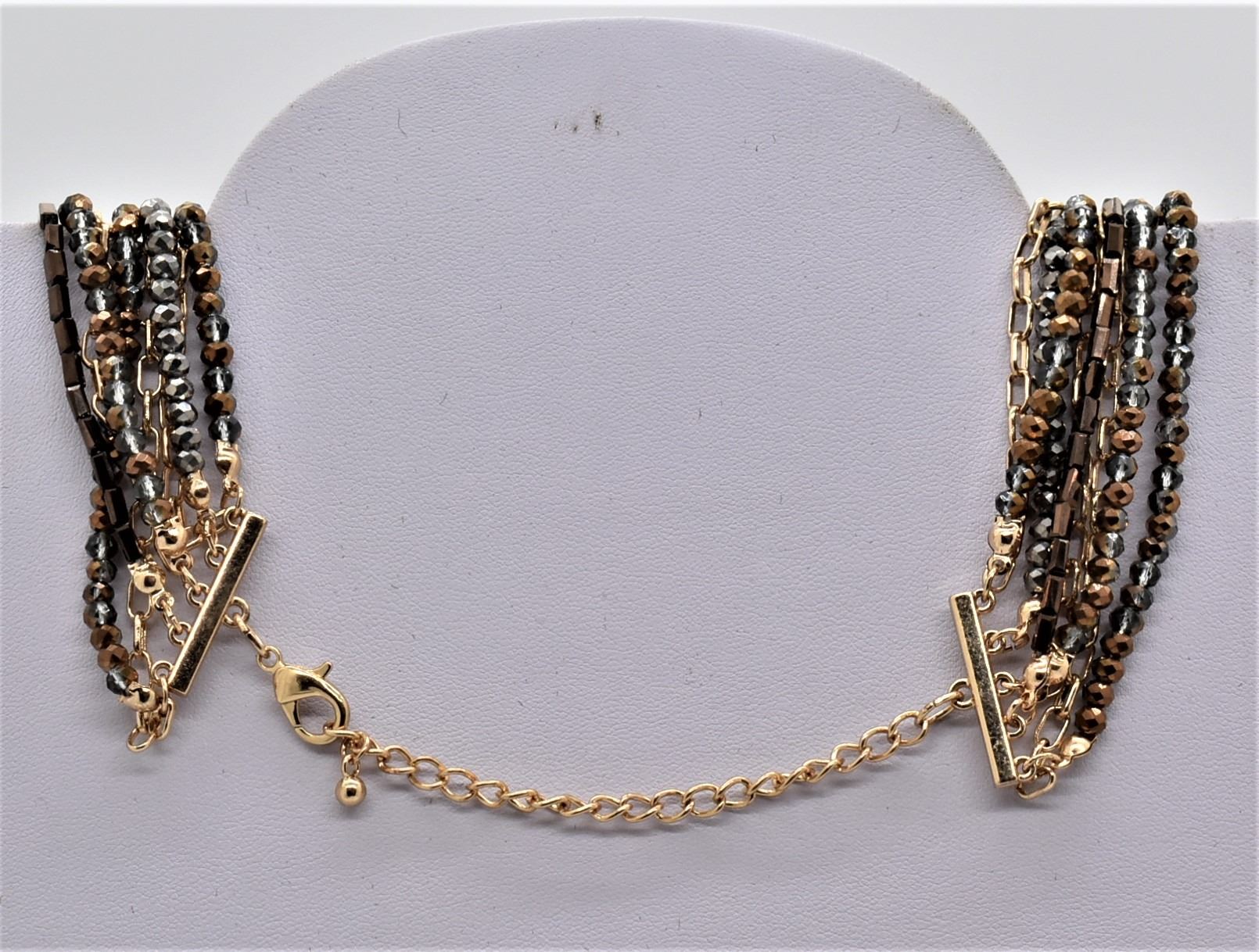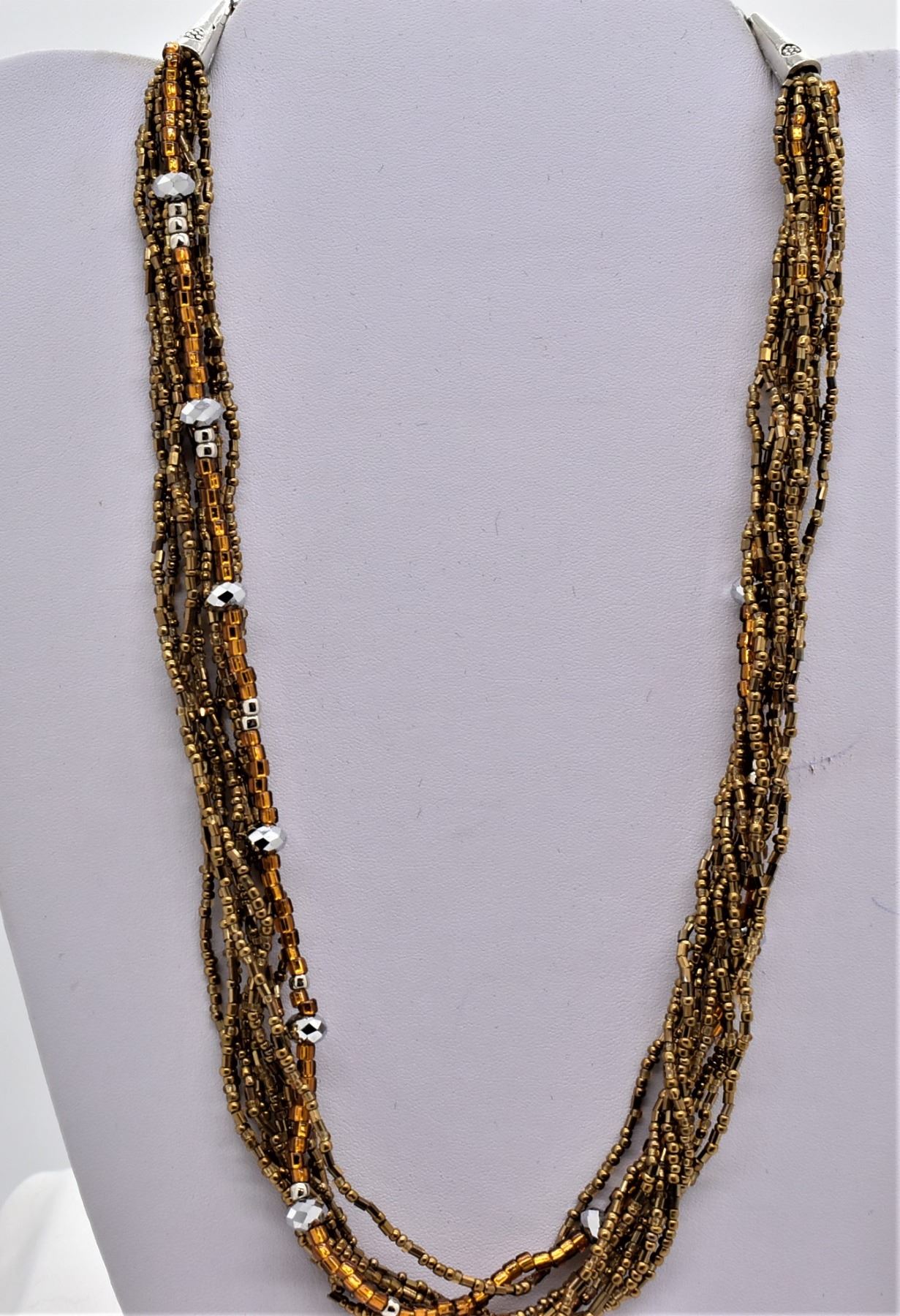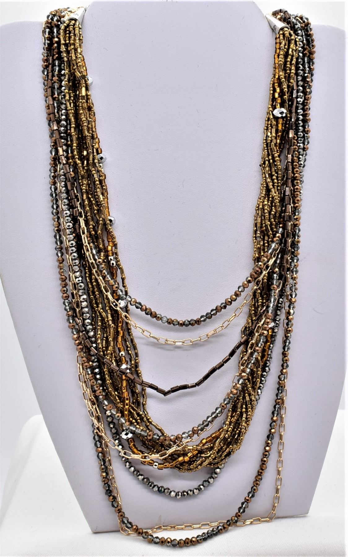 2 Iridescent Bead Necklaces, includes 10 Strand Gold Tone Bead Necklace designed and beaded by Kathy Kills Thunder and 8 Strand Tiered Bead and Chain Necklace (longest strand measures 30''L end to end with a 3.25''L chain extender to shorten it)