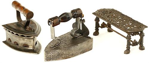 2 Bügeleisen und 1 Untersetzer 1) Schmiedeeisernes Schütteisen, mit Lyra-förmigem Fallschieber, Deutschland um 1820, ohne Bolzen, Länge 23 cm. - Und: 2) Indisches Kohleeisen, signiert "BNS 10", Länge 19,5 cm. - Sowie: 3) Hoher Bügeleisen-Untersetzer, Eisenguß, Länge 28 cm.