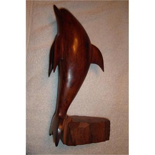 This is for 2 Ironwood Dolphins. The Largest one is upright and is 12" from base to nose. This one has eyes carved in it. The Smaller one is upright and is 11" from base to nose. This one is of darker wood and has no eyes. To carve ironwood they must use a diamond point bit. It is very heavy for its size.