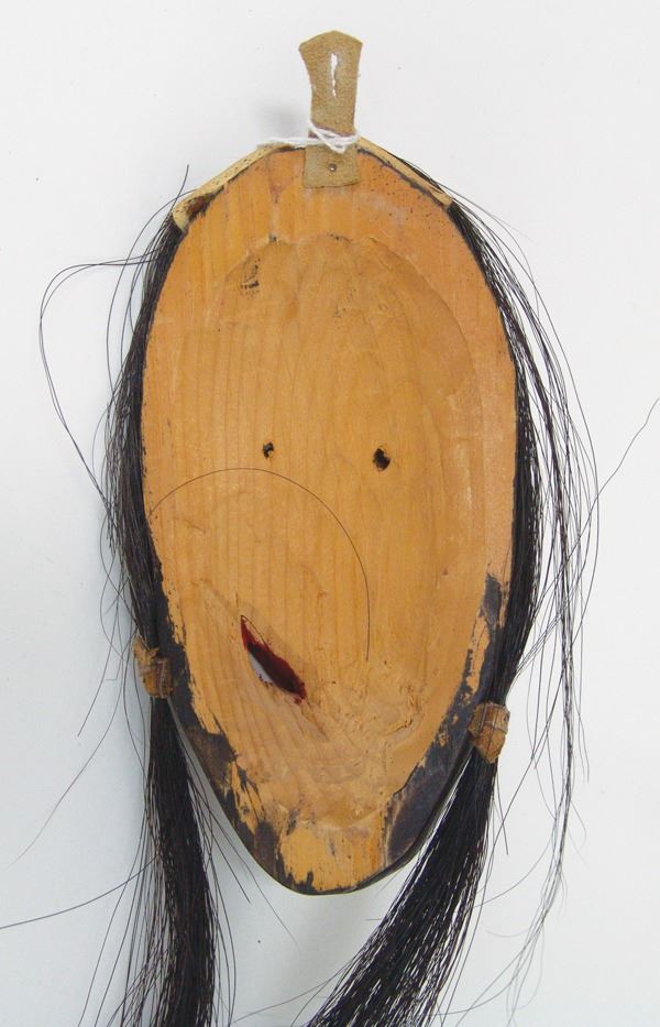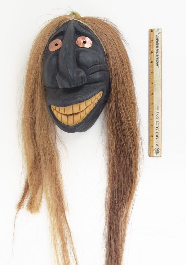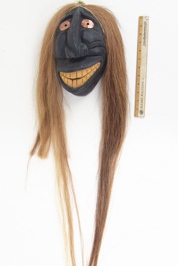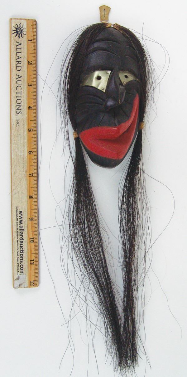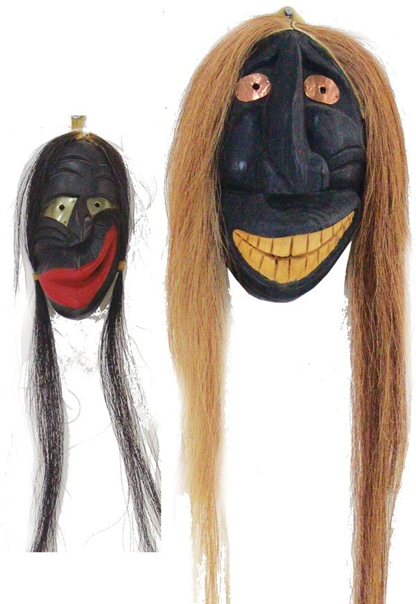 Pair of traditional hand carved and painted, "broken nose" masks with tin/copper clad eyes and with horsehair, the smaller labeled "Guardian Style." Very good condition.Mid/Late 1900sLargest 11"