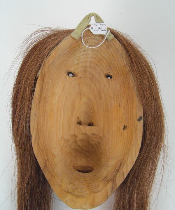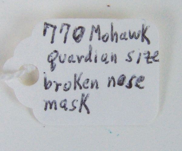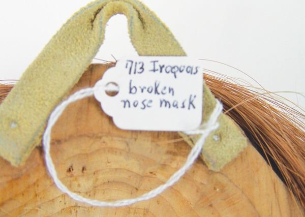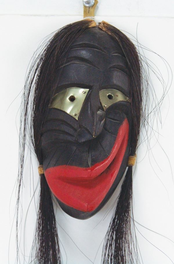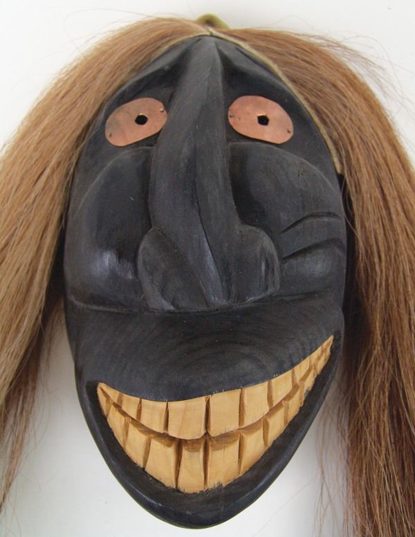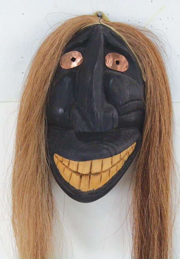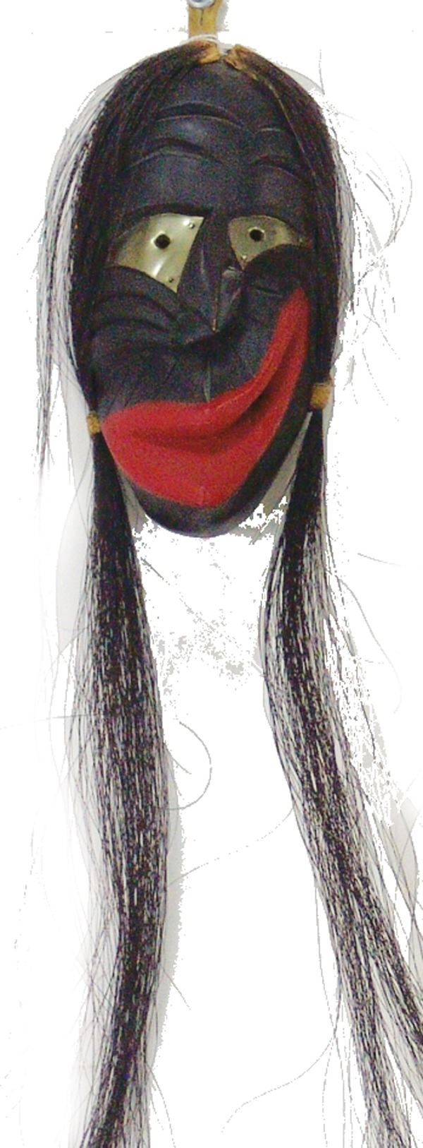 Pair of traditional hand carved and painted, "broken nose" masks with tin/copper clad eyes and with horsehair, the smaller labeled "Guardian Style." Very good condition.Mid/Late 1900sLargest 11"