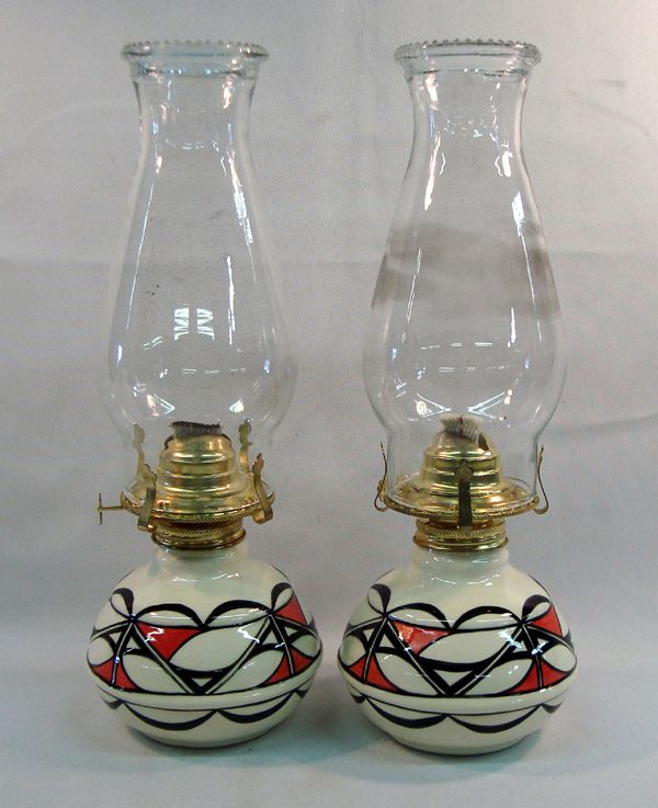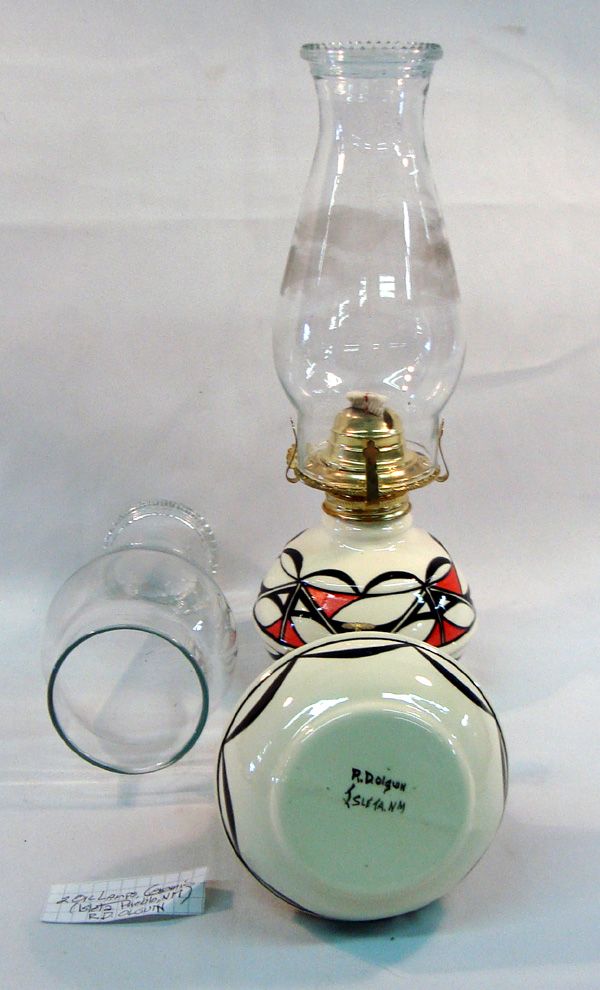 2 Isleta Pueblo Ceramic Oil Lamps Signed. Measures approx. 13''H x 4 7/8''W.