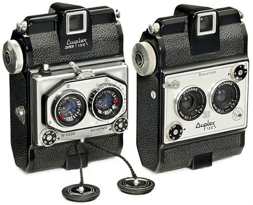 2 Stereo Cameras "Duplex 120" ISO, Milan. 1) "Duplex 120", 1956. No. 02172, for 24 x 23 mm on rollfilm 120, "Iperang 6,3/25" fix focus lenses, self-cocking shutter. With case. - And: 2) "Duplex Super 120", 1956. No. 5206, "Iriar 3,5/35", focusing scale meter, late model with lever for stereo or single exposures.<Br>