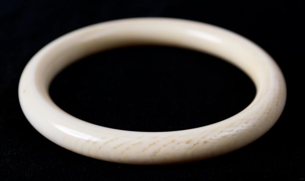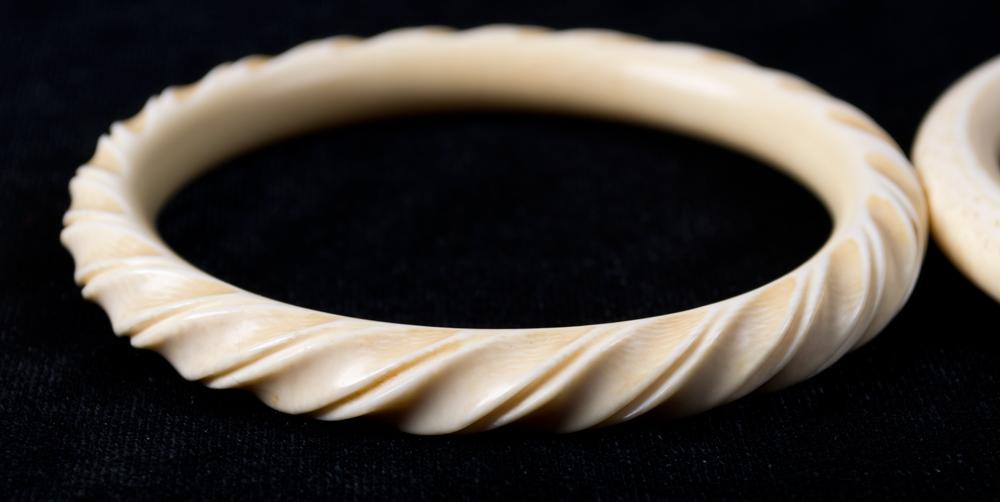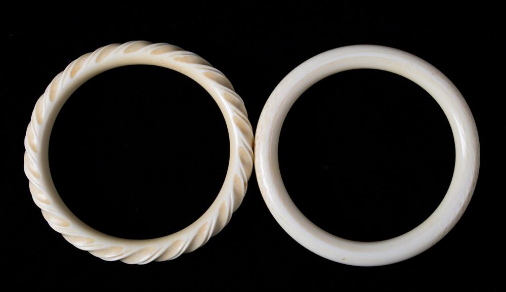 One bracelet is simple circular shape with slight toned patina, the other is a barley twist circular shape. Both very good shape, no cracks, damage, or repairs. Circa mid 20th century.