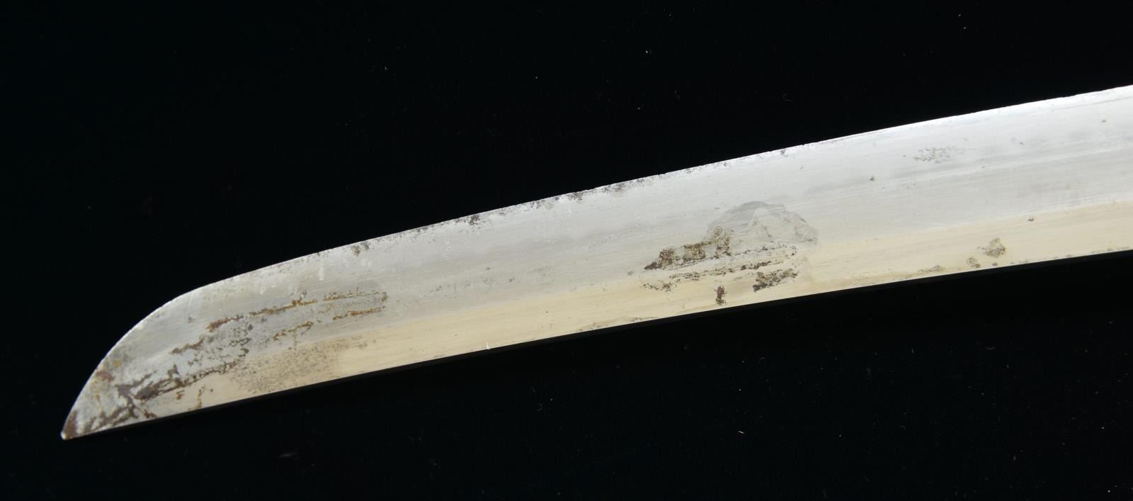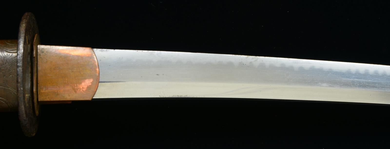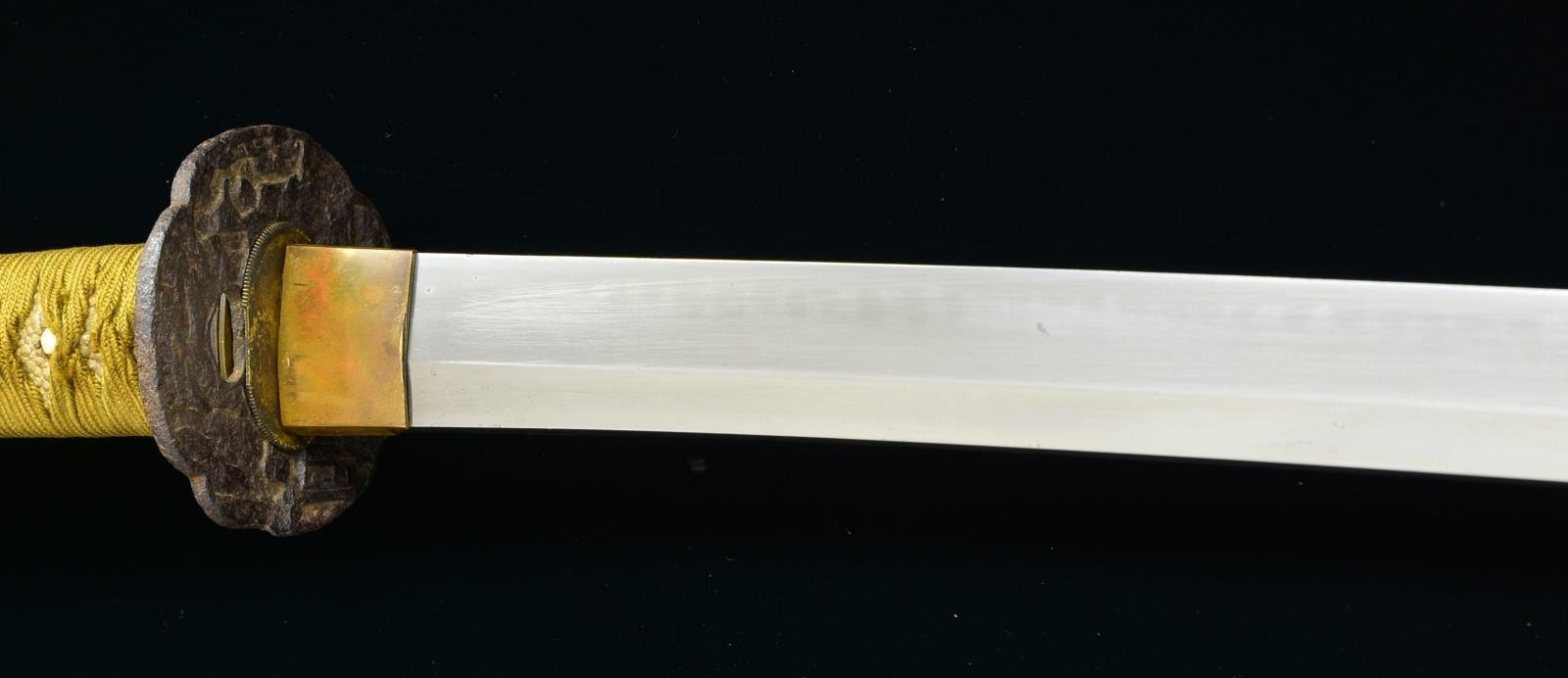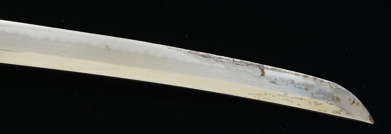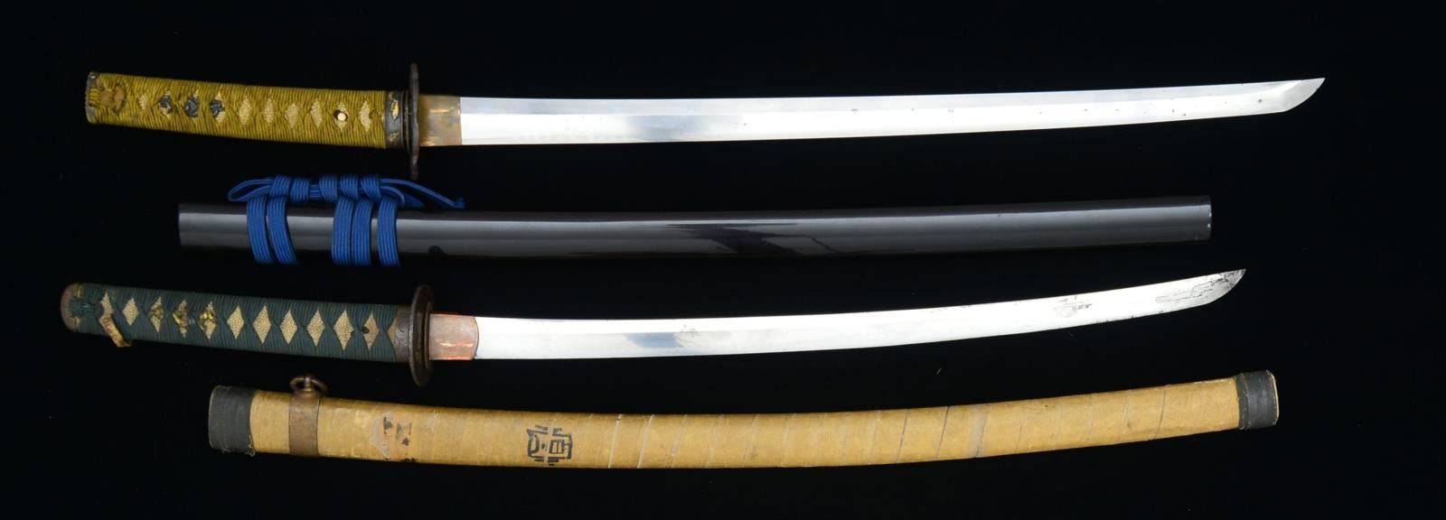 1) Overall length: 34". Blade length: 23 7/8". Blade has a wavy hamon & a copper habaki. Crude iron tsuba seems to depict a village or cave scene. There is 1 seppa above & below the tsuba. Nakago has a 7 character signature & 2 mekugi-ano. Tsuka has matching kashira, fuchi & menuki. White same w/ gold/yellow tsuka-ito. Black enameled wooden saya w/ blue cord attached. CONDITION: blade has a good polish w/ no major flaws. Tsuka shows light overall wear. Tsuba has a worn ancient look. Saya shows little wear & appears to be a replacement. (02-15013 /BF). 2) Overall length: 37". Blade length: 22 1/4". Blade has a wavy hamon & a copper habaki. Crude iron tsuba w/ cut out decoration. There is 1 seppa below the tsuba. Nakago has a 6 character signature w/ 2 mekugi-ano. Tsuka has matching kashira, fuchi & menuki. White same has a blue/green tsuka-ito. Wooden saya wrapped w/ tape w/ Japanese characters written on the outside. CONDITION: blade has staining & oxidation near the tip. Tsuba has an ancient patina. Tsuka shows light wear overall. Saya remains strong but has been wrapped. (02-15016/BF). $800-1,300.