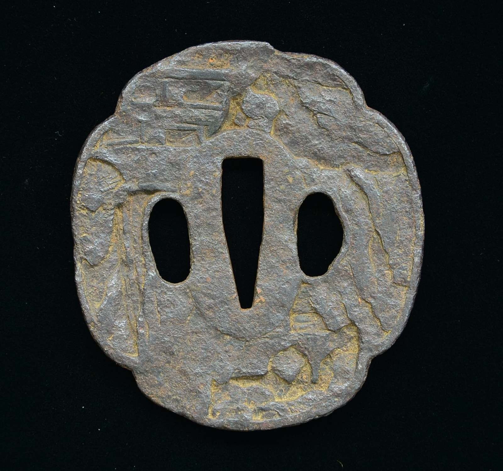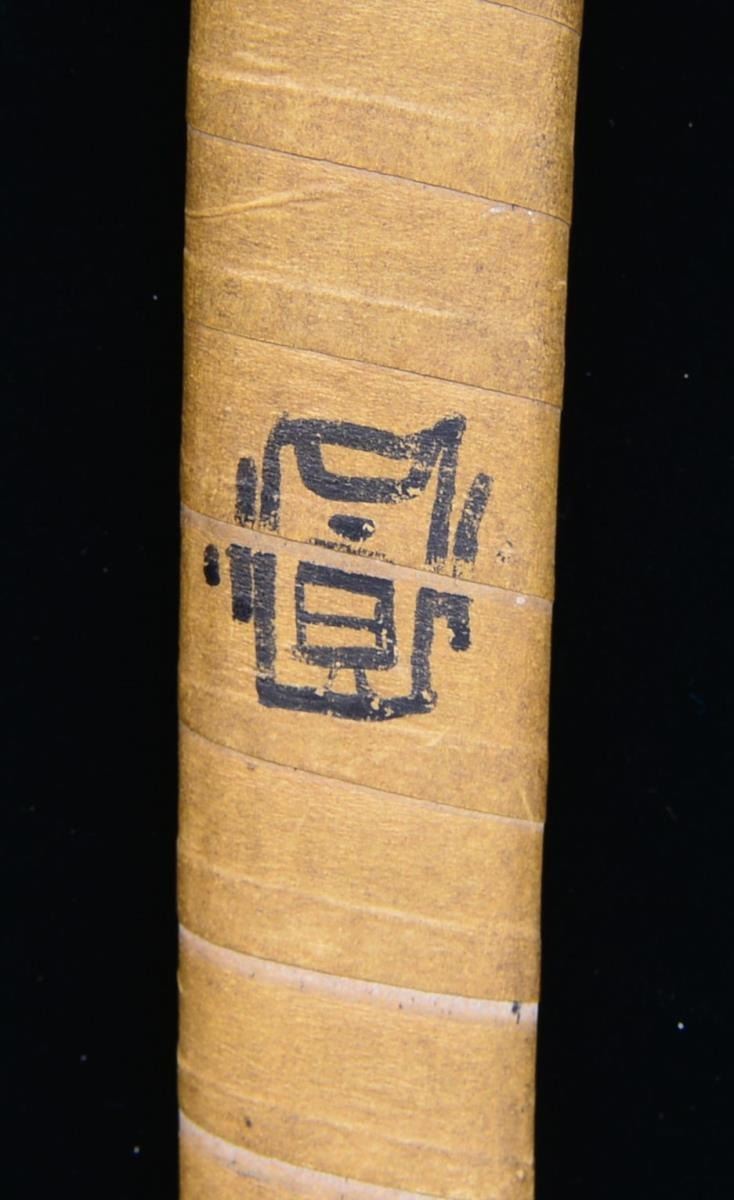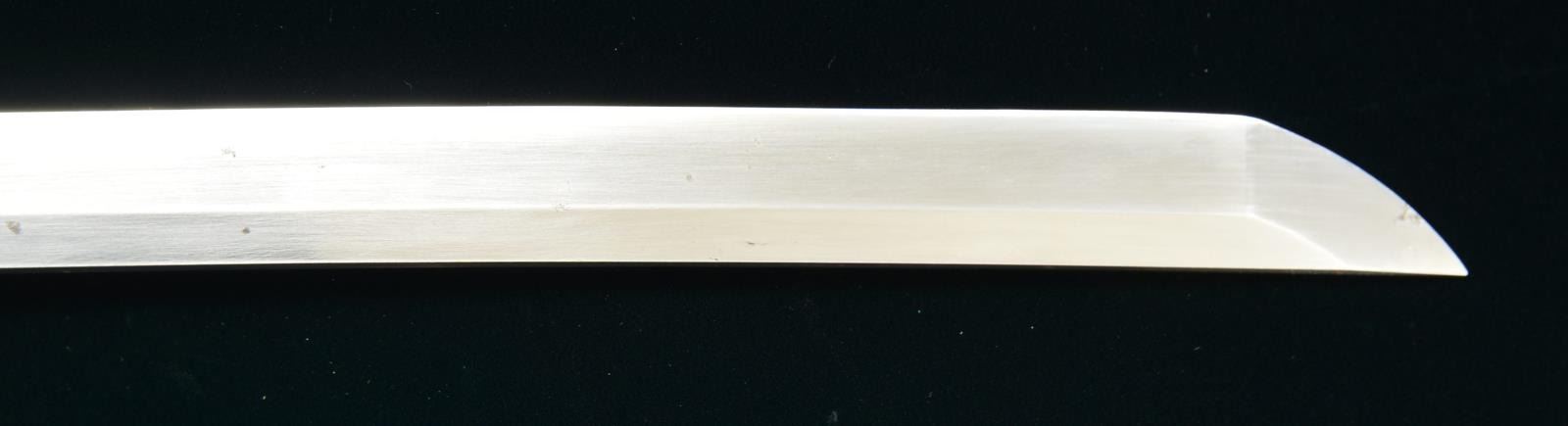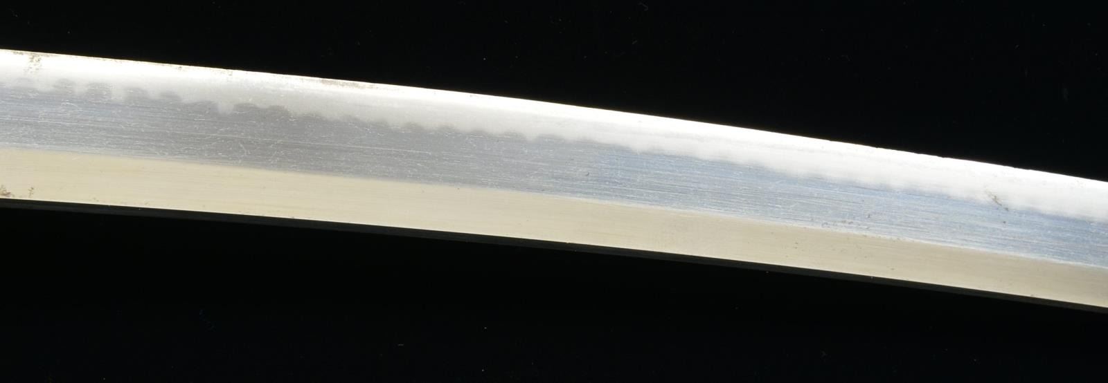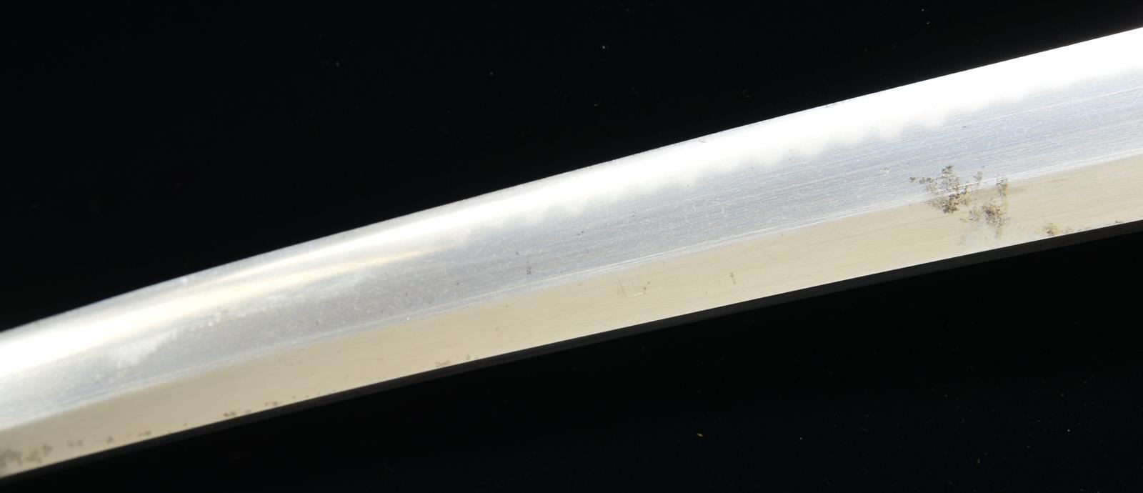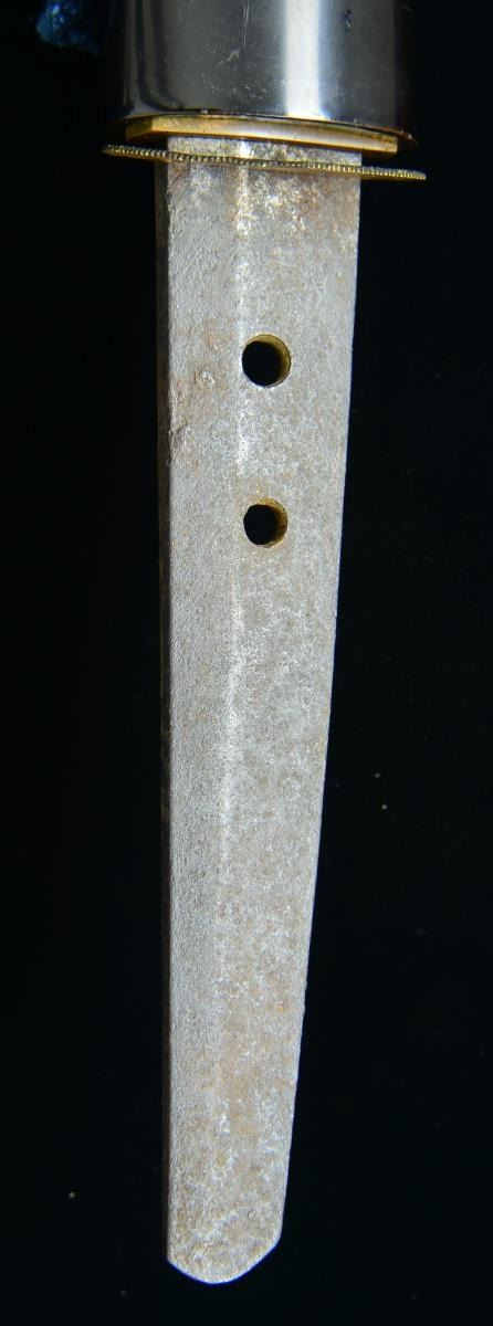 1) Overall length: 34". Blade length: 23 7/8". Blade has a wavy hamon & a copper habaki. Crude iron tsuba seems to depict a village or cave scene. There is 1 seppa above & below the tsuba. Nakago has a 7 character signature & 2 mekugi-ano. Tsuka has matching kashira, fuchi & menuki. White same w/ gold/yellow tsuka-ito. Black enameled wooden saya w/ blue cord attached. CONDITION: blade has a good polish w/ no major flaws. Tsuka shows light overall wear. Tsuba has a worn ancient look. Saya shows little wear & appears to be a replacement. (02-15013 /BF). 2) Overall length: 37". Blade length: 22 1/4". Blade has a wavy hamon & a copper habaki. Crude iron tsuba w/ cut out decoration. There is 1 seppa below the tsuba. Nakago has a 6 character signature w/ 2 mekugi-ano. Tsuka has matching kashira, fuchi & menuki. White same has a blue/green tsuka-ito. Wooden saya wrapped w/ tape w/ Japanese characters written on the outside. CONDITION: blade has staining & oxidation near the tip. Tsuba has an ancient patina. Tsuka shows light wear overall. Saya remains strong but has been wrapped. (02-15016/BF). $800-1,300.