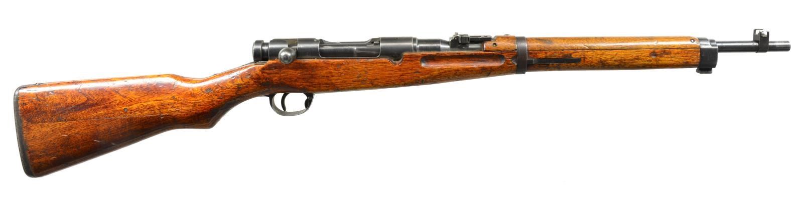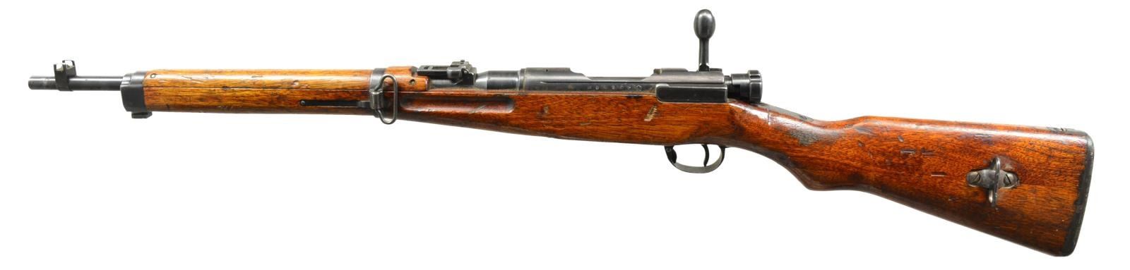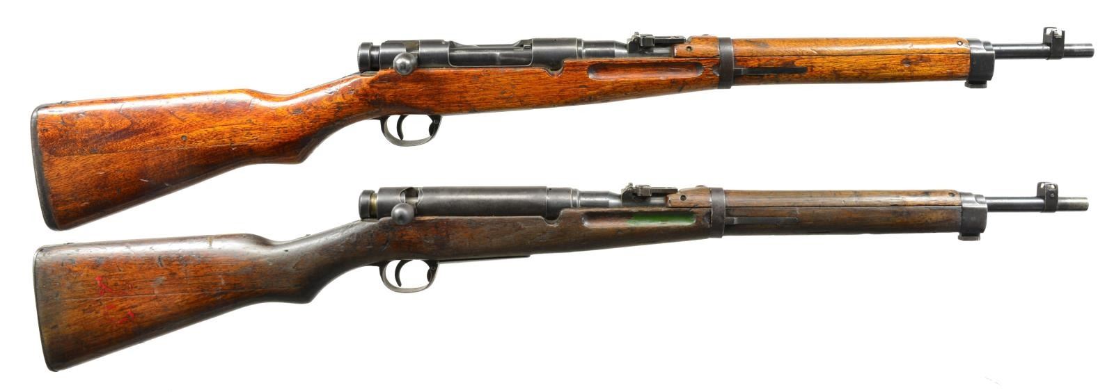 1) Cal. 6.5 Jap. S# 90207. Bbl. 19". S# match on bolt, receiver & bayonet lug. Receiver marked on left rail w/ Nagoya Arsenal marking. Receiver marked on top w/ characters for “Type 38”. Mum is crisp, but has 2 crossed chisel marks. Straight bolt handle w/ oval knob. Checkered, notched safety knob. Ladder rear sight graduated to 2000m. Inverted V front sight w/ protective ears. Cleaning rod is not present. Side sling swivels. Cup type buttplate. Hardwood stock set w/ 2 piece construction. CONDITION: original finish stock set has heavy wear, dents & scratches. Sm. crack on left side of butt at heel. Metal retains 60% original blue w/ thinning, wear, oxidation & scattered, shallow pitting. Good, shiny bore w/ worn lands. (20-2216/RW). 2) Cal. 6.5 Jap. S# 008177. Bbl. 19". Receiver is marked on left rail w/ interlocking circles indicated mfg. at Koshikawa Arsenal. Receiver ring has mum w/ 3 cuts. Crisp “Type 38” characters & additional Japanese character below mum that indicates rifle was withdrawn from service for school use. Nonmatching numbers throughout. Bolt has straight handle w/ oval knob. Checkered safety knob w/ sm. tang. Correct type unnumbered dust cover. Ladder rear sight graduated to 2000m. Inverted V front sight w/ protective ears. Cleaning rod is not present. Bayonet lug. Side sling swivels. Flat, steel buttplate. Hardwood stock set. Buttstock has 2 piece construction. Buttstock is numbered in cheek area “10”. Faint, red number “20” on right side of butt. Inside forward ends of grasping grooves painted green. CONDITION: stock set has wear, dents, scratches & staining throughout showing extensive service. Metal has 50% original blue w/ wear, oxidation & areas of fine pitting. Bore is shiny w/ worn lands. (20-2221/RW). BOTH CURIO. $600-800.