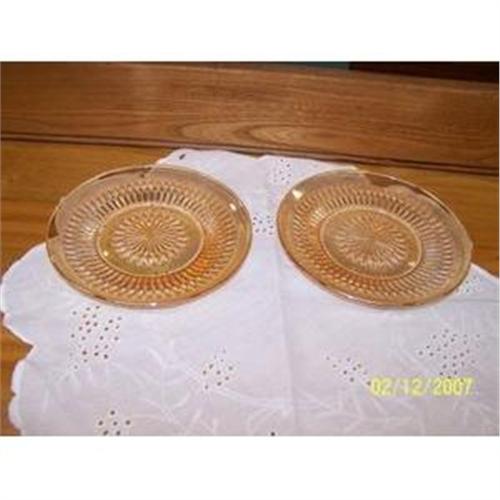Up for sale are 2 Jeanette "Anniversary" They were made from 1947 to 1949. Depression Plates. They?re in very good condition with no chips, cracks or breaks.Any glares you might see are not from the piece itself. We have 52 lights in our antique store so there are times when all the lighting and/or the flash in the camera can make a picture(s) look distorted.