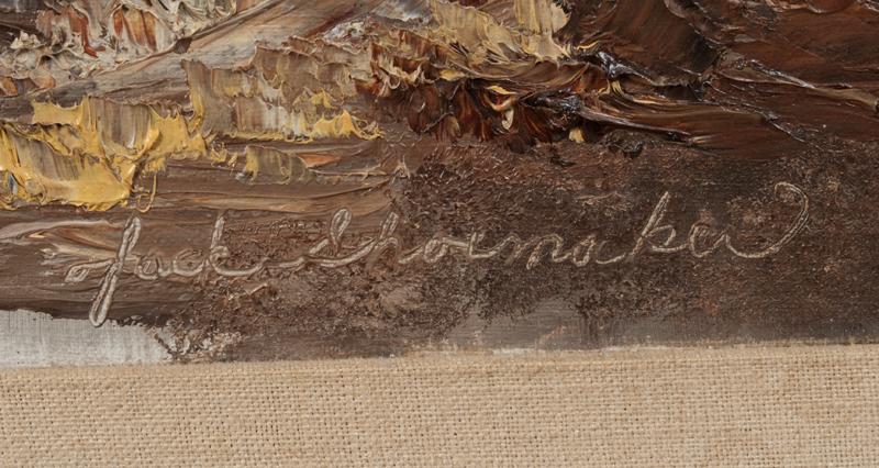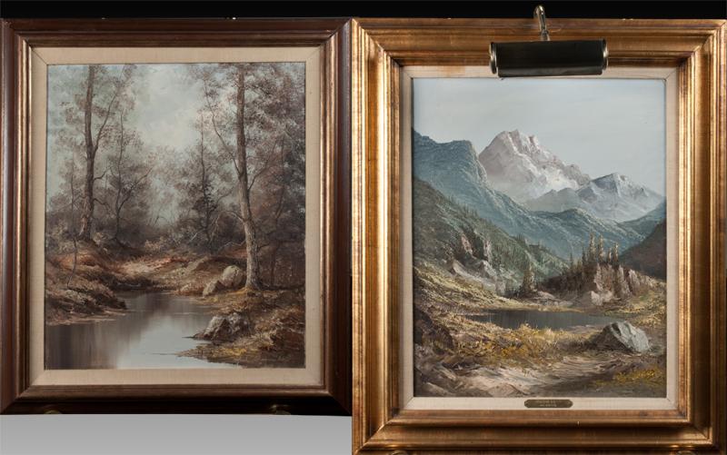 One titled "Peaceful Valley," depicting a mountain range and a body of water. Other depicting a landscape with pond. Both signed LR. Jack Shoemaker was a Michigan artist working in the middle 20th century known for his landscapes, both very well done. One with name plaque and museum light. Largest 24" H x 20" W (sight), both nicely framed. Circa 1950's.