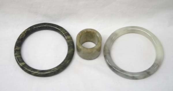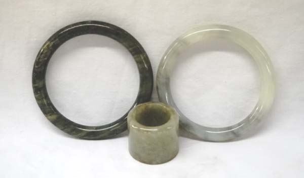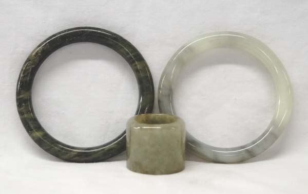2 Jade Bangle Bracelets and Jade Bow Finger Guard, bangles measure 3.25''D