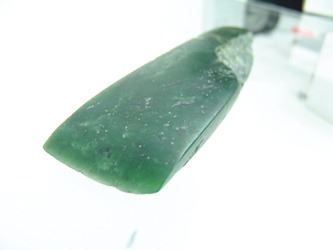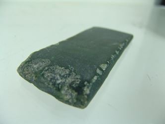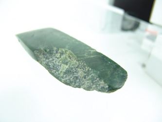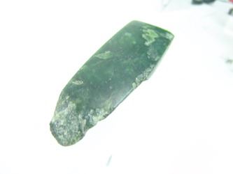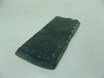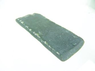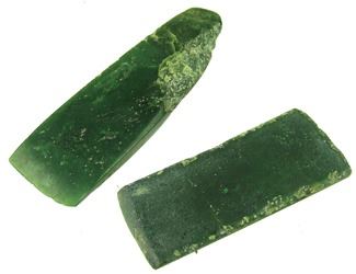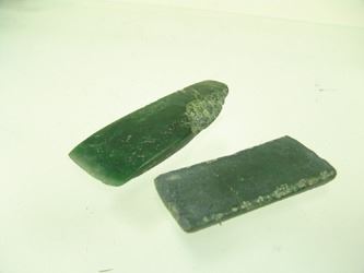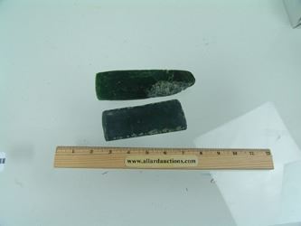 Pair of hand carved pieces of jade (?) made into chisels, each with a sharpened edge. Good condition. Age unknown. 6", 4-3/4"