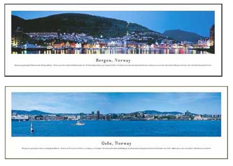 2 Panorama Photo Prints * * * Artist: James BlakewayTitle: Bergen, NorwayMedium: Print on paperPaper size: 13 1/2 x 40 inches * * * Artist: James BlakewayTitle: Oslo, NorwayMedium: Print on paperPaper size: 13 1/2 x 40 inches * * * Condition: Excellent *