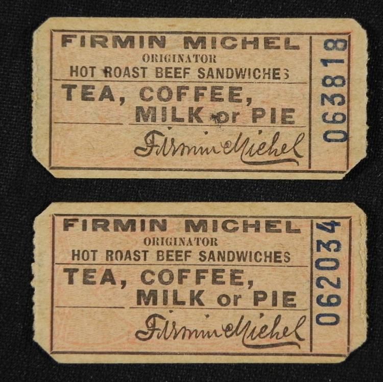 These are two original concession tickets from the Jamestown Tercentennial Exposition, which took place in Hampton Roads, Virginia in 1907. Each ticket is in very good condition. Firmin Michel claimed to be the originator of the hot roast beef sandwich, and he appeared at the Buffalo and St. Louis World Fairs as well. * * These are scarce pieces of American World's Fair memorabilia.