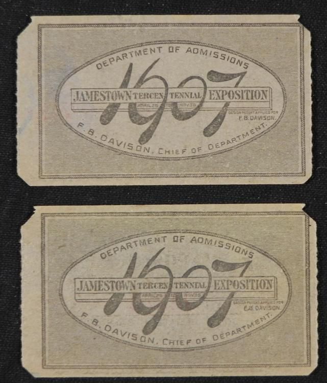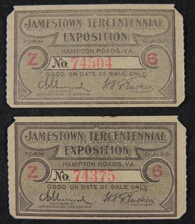 These are two original admission tickets to the Jamestown Tercentennial Exposition, which took place in Hampton Roads, Virginia in 1907. Each ticket is in very good condition, stamped in red with a number. * * These are highly collectible for any World's Fair aficionado. <a href="https://www.google.com/search?hl=en&client=firefox-a&hs=yYy&tbo=d&rls=org.mozilla:en-US:official&spell=1&q=aficionado.&sa=X&ei=N3e_UKDRGY689QSI5IGgBw&ved=0CC0QBSgA"></a>